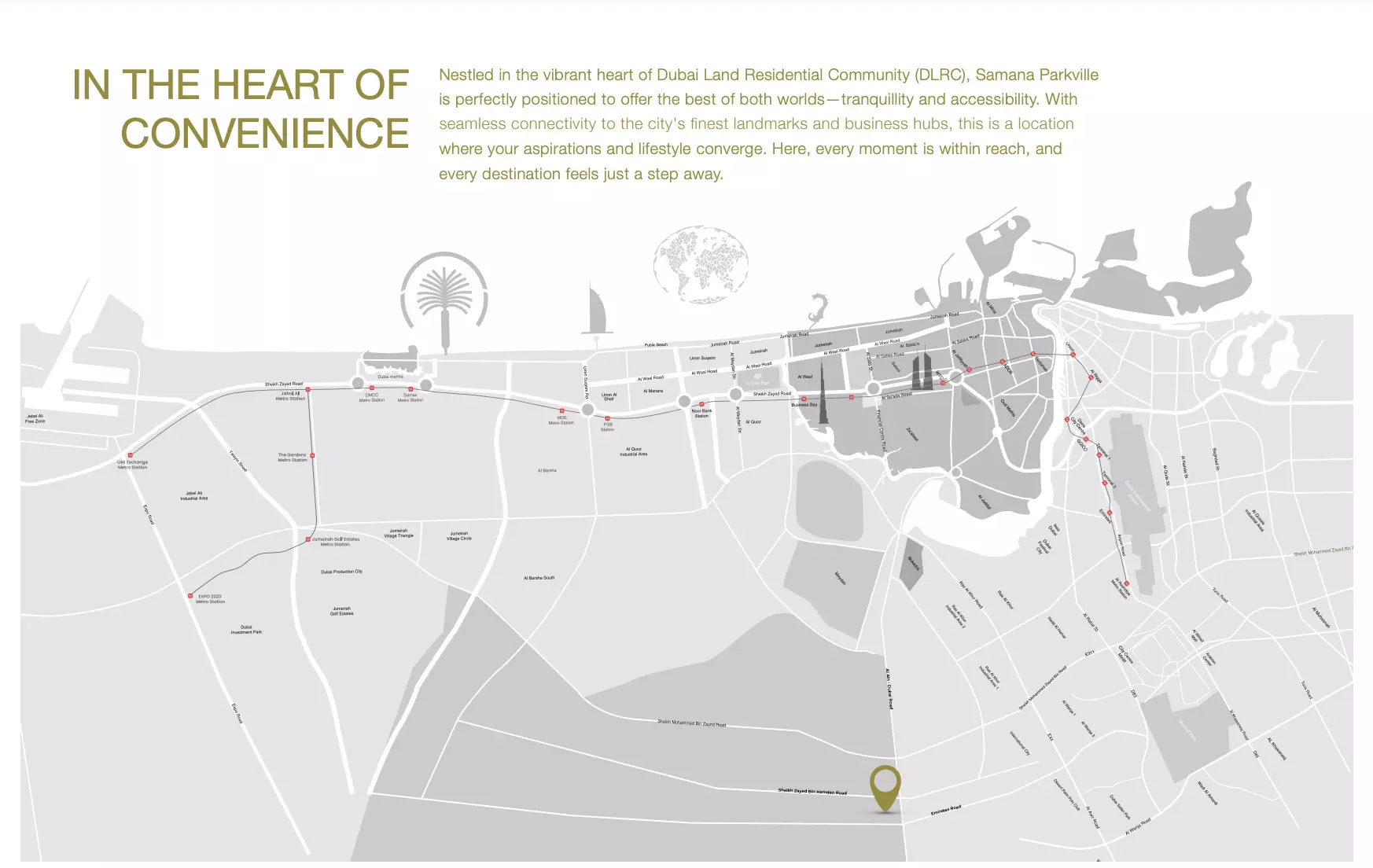 Samana Parkville is strategically located in the Dubai Land Residence Complex (DLRC), offering seamless connectivity to major highways like Emirates Road and Al Ain Road. It's in close proximity to landmarks such as Downtown Dubai, Global Village, Miracle Garden, and Dubai Outlet Mall.