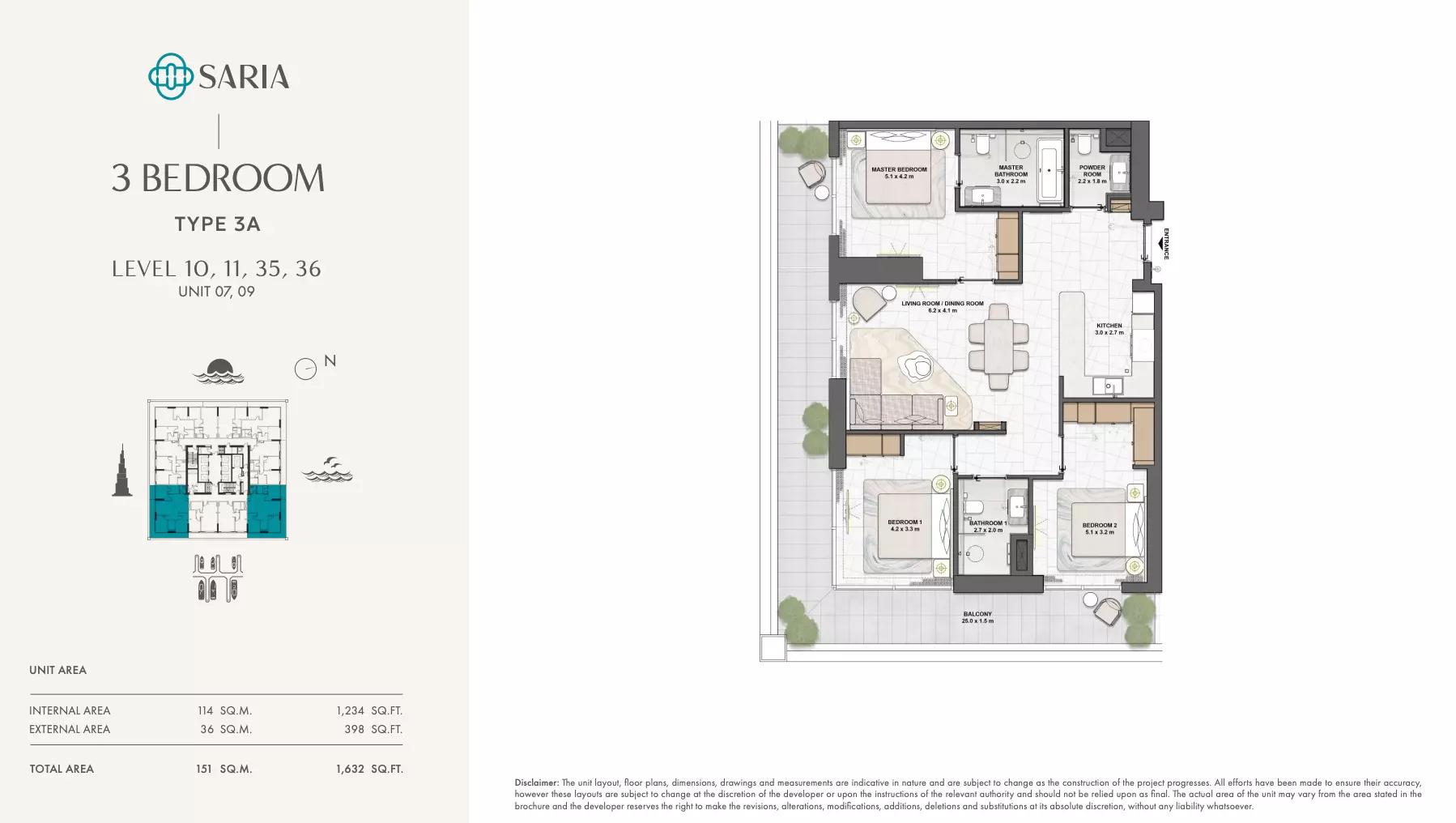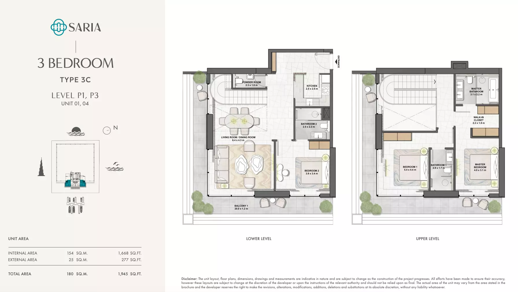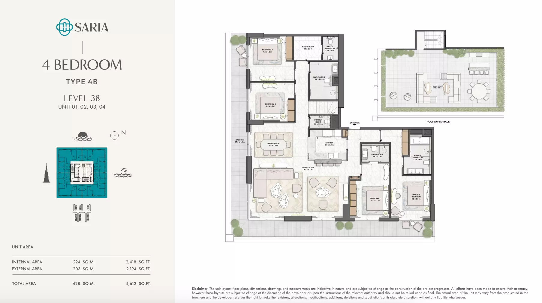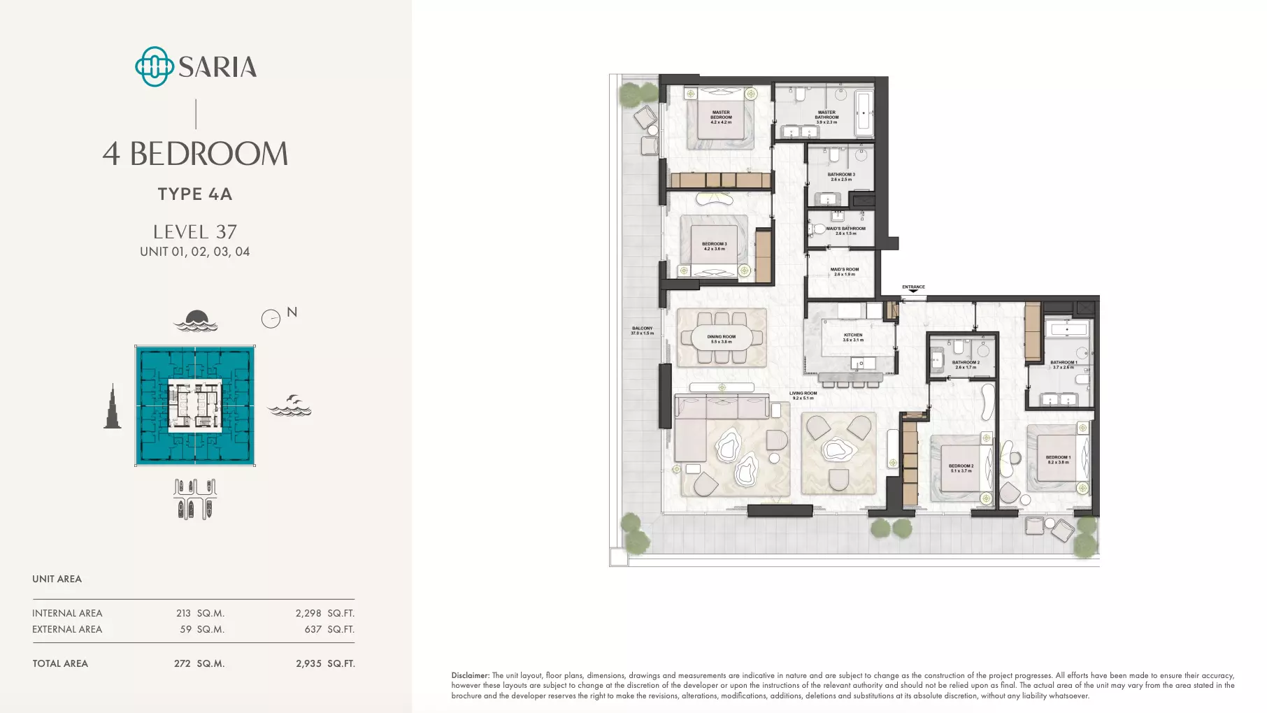 Saria offers a variety of housing options, including apartments, duplexes, and penthouses. 1 Bedroom Apartments range from 758 to 838 sqft, with prices starting from 1.7M AED. 2 Bedroom Apartments range from 1257 to 1262 sqft, with prices starting from 3M AED. 3 Bedroom Apartments range from 1632 to 1685 sqft, with prices starting from 5.1M AED. For those seeking more space: 2 Bedroom Duplexes are 1399 sqft, with prices starting from 3M AED. 3 Bedroom Duplexes are 1945 sqft, with prices starting from 5.1M AED. Additionally, the Penthouse options feature 4 Bedrooms, with sizes ranging from 2935 to 4612 sqft, starting at 16M AED.