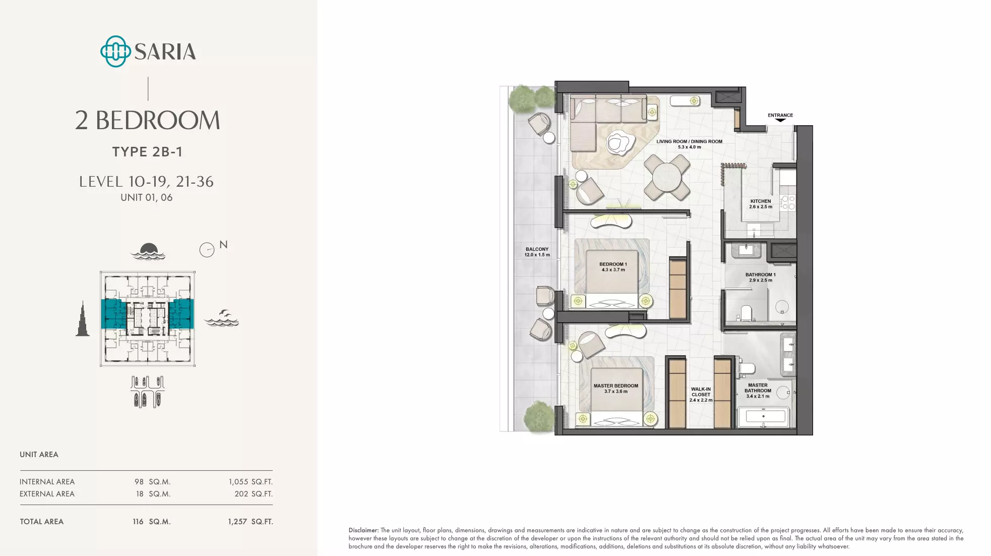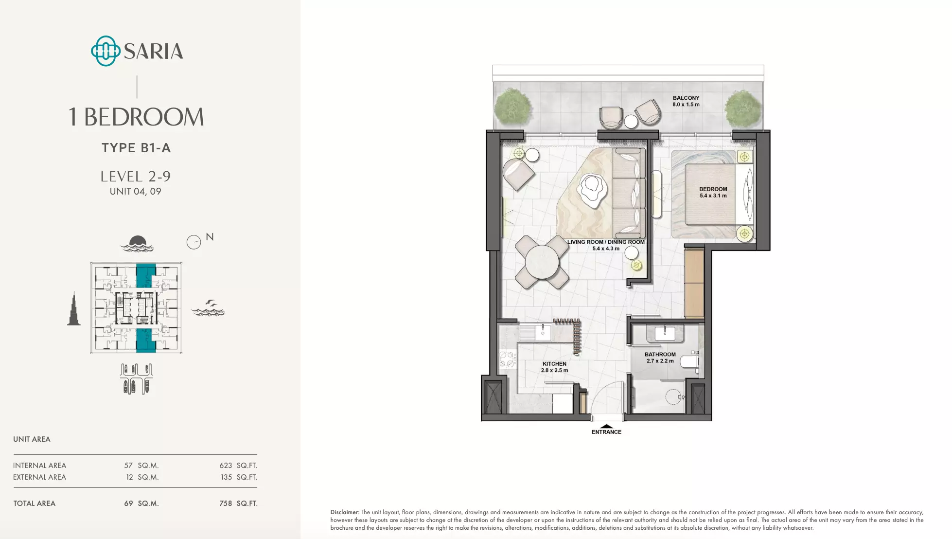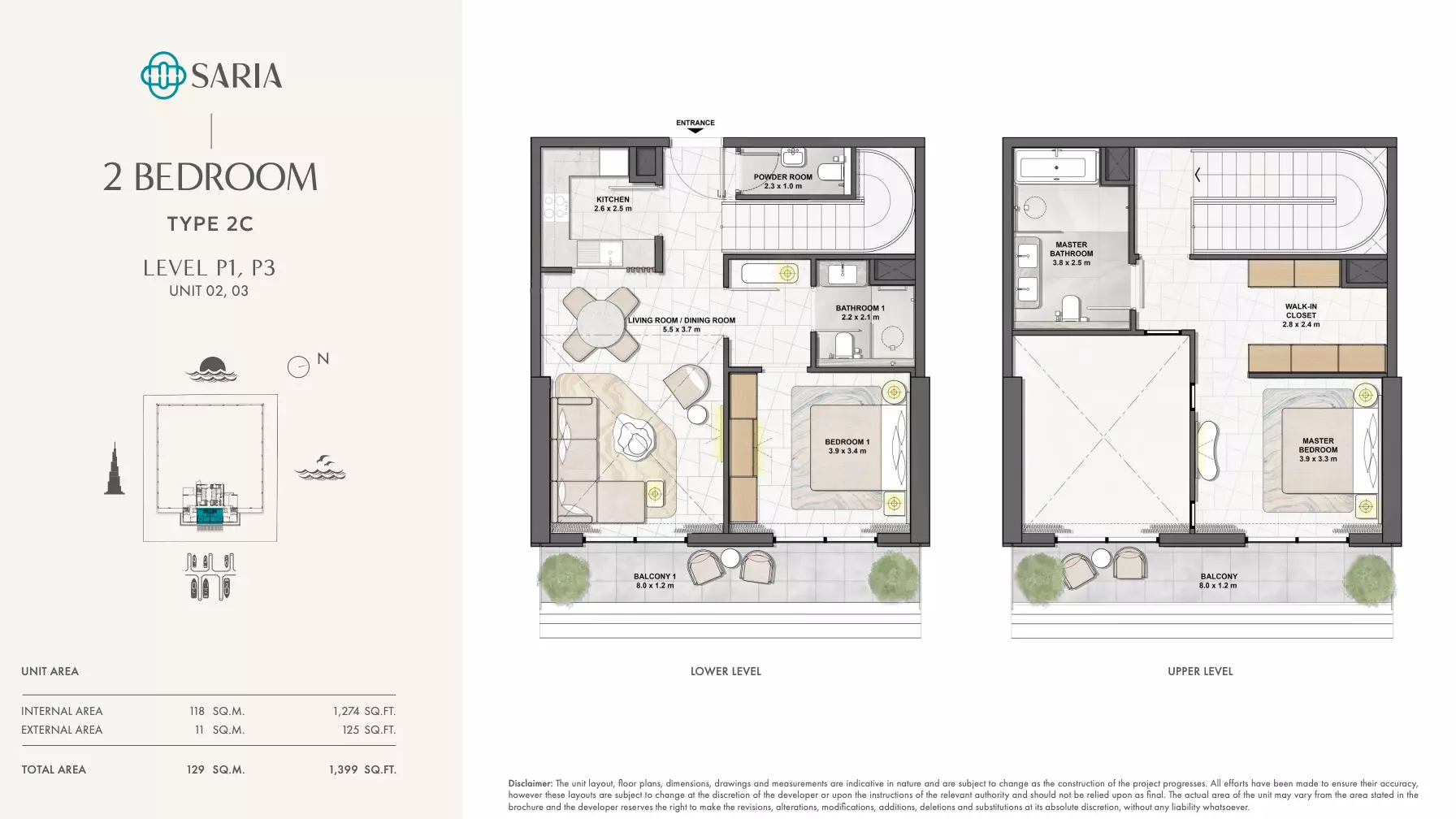 Saria offers a variety of housing options, including apartments, duplexes, and penthouses. 1 Bedroom Apartments range from 758 to 838 sqft, with prices starting from 1.7M AED. 2 Bedroom Apartments range from 1257 to 1262 sqft, with prices starting from 3M AED. 3 Bedroom Apartments range from 1632 to 1685 sqft, with prices starting from 5.1M AED. For those seeking more space: 2 Bedroom Duplexes are 1399 sqft, with prices starting from 3M AED. 3 Bedroom Duplexes are 1945 sqft, with prices starting from 5.1M AED. Additionally, the Penthouse options feature 4 Bedrooms, with sizes ranging from 2935 to 4612 sqft, starting at 16M AED.