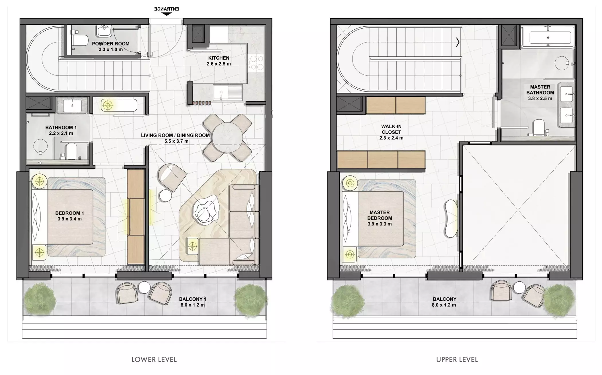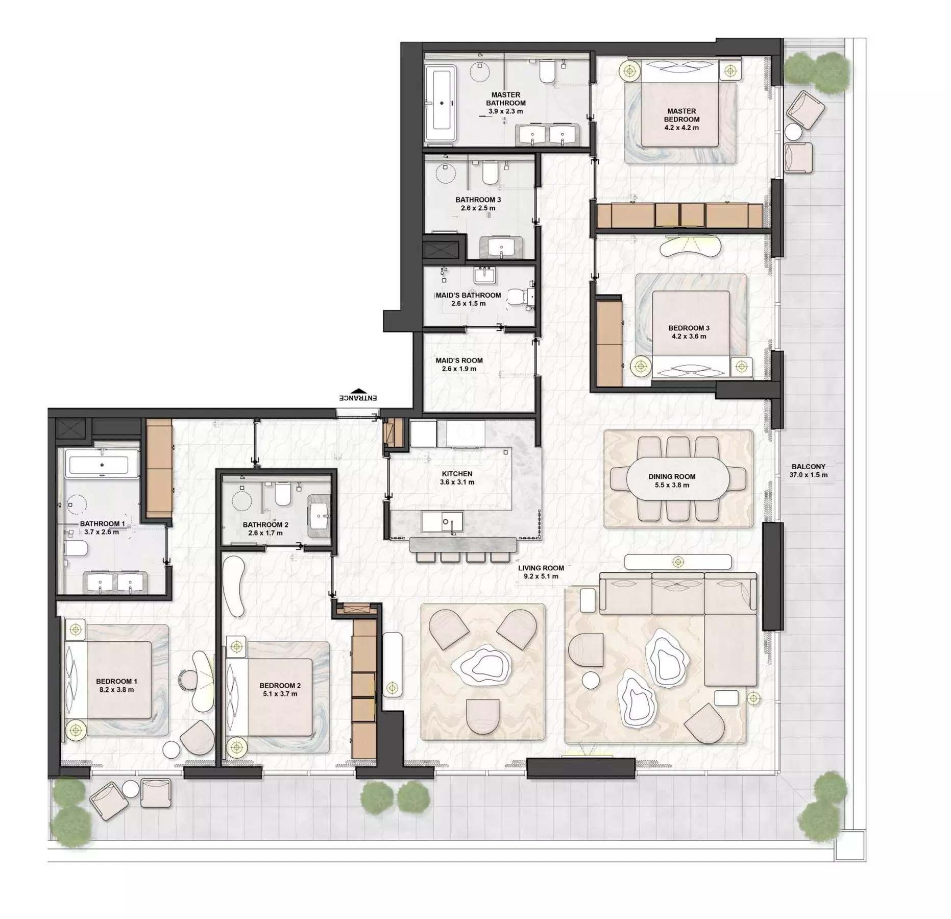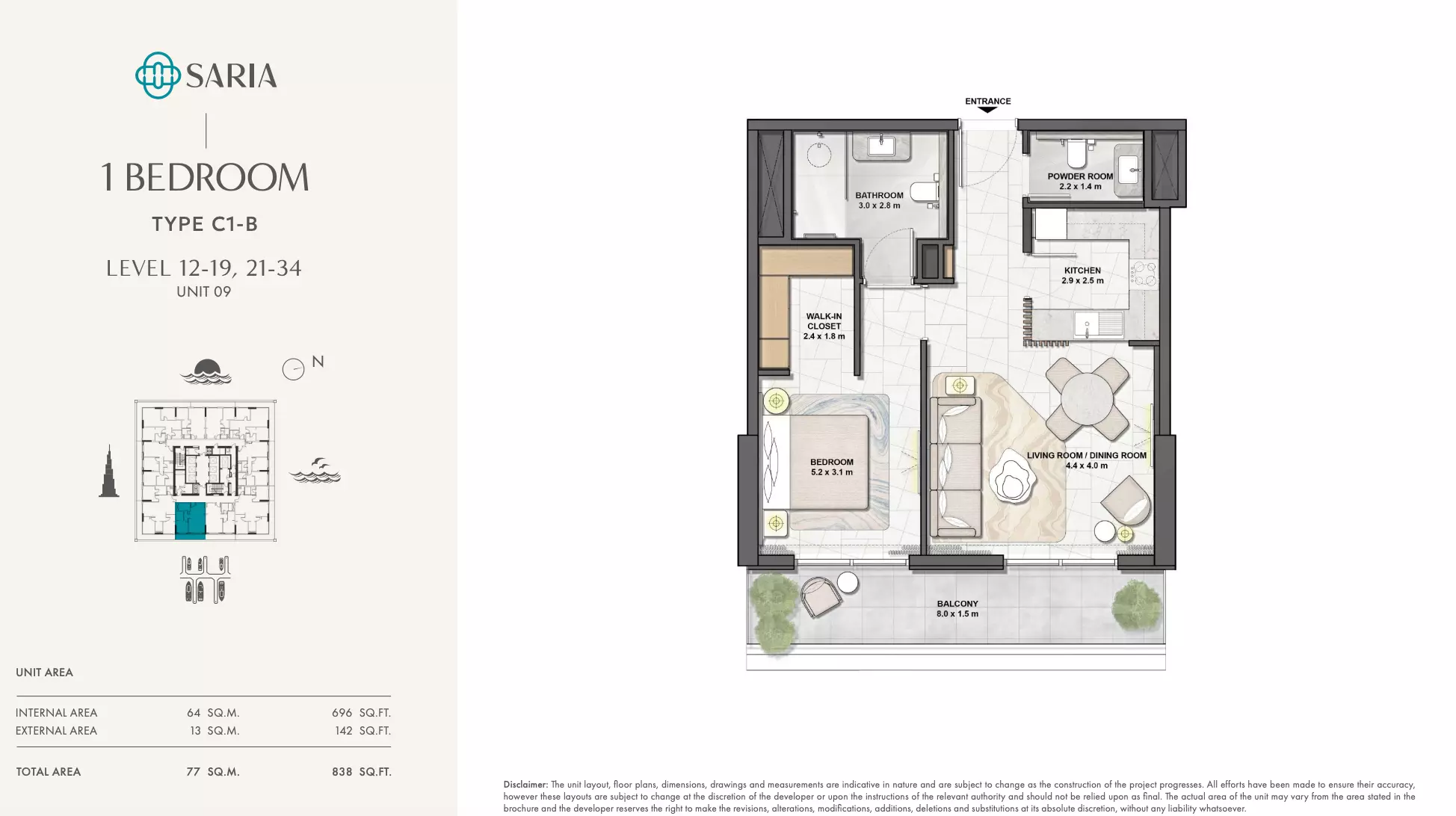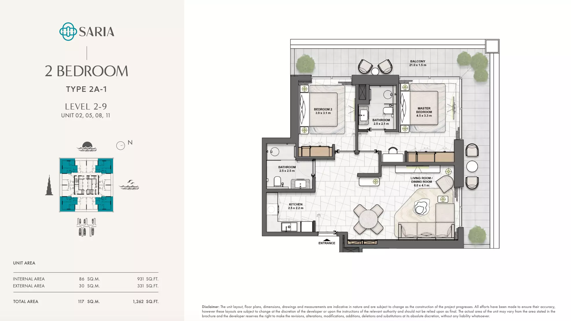 Saria offers a variety of housing options, including apartments, duplexes, and penthouses. 1 Bedroom Apartments range from 758 to 838 sqft, with prices starting from 1.7M AED. 2 Bedroom Apartments range from 1257 to 1262 sqft, with prices starting from 3M AED. 3 Bedroom Apartments range from 1632 to 1685 sqft, with prices starting from 5.1M AED. For those seeking more space: 2 Bedroom Duplexes are 1399 sqft, with prices starting from 3M AED. 3 Bedroom Duplexes are 1945 sqft, with prices starting from 5.1M AED. Additionally, the Penthouse options feature 4 Bedrooms, with sizes ranging from 2935 to 4612 sqft, starting at 16M AED.