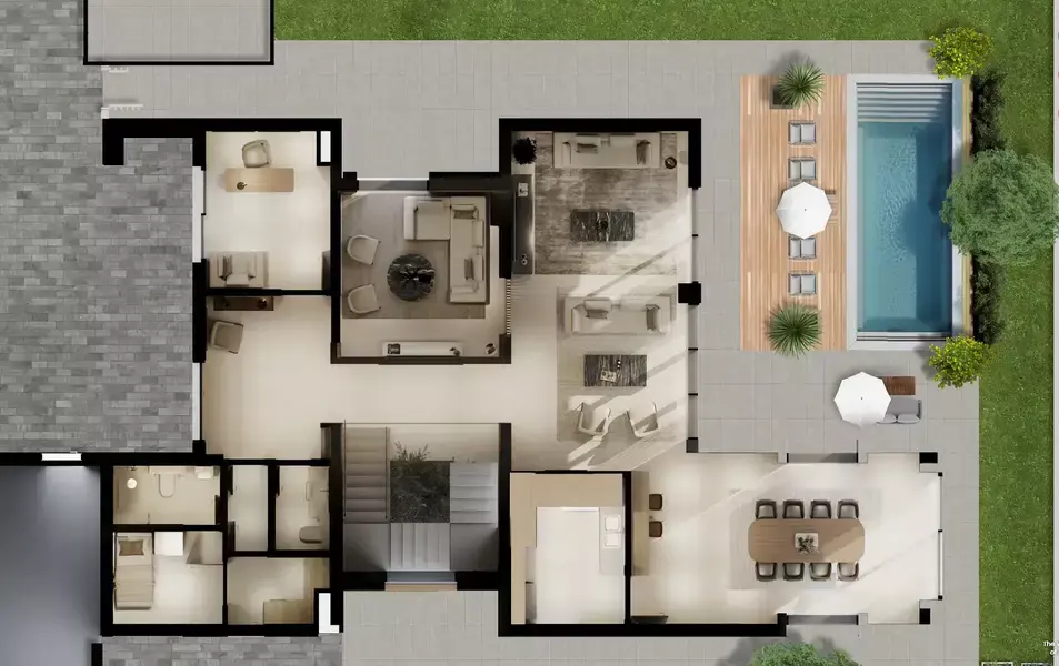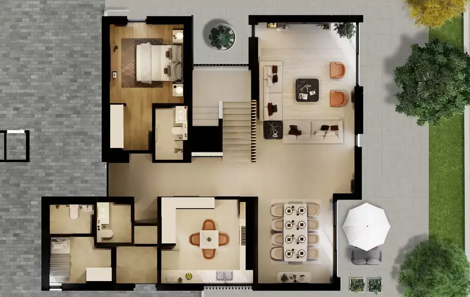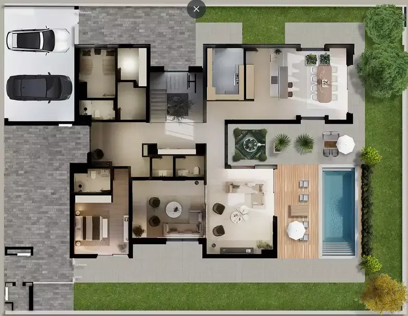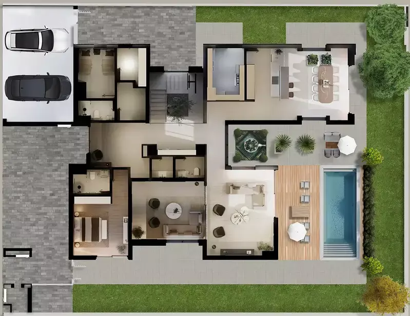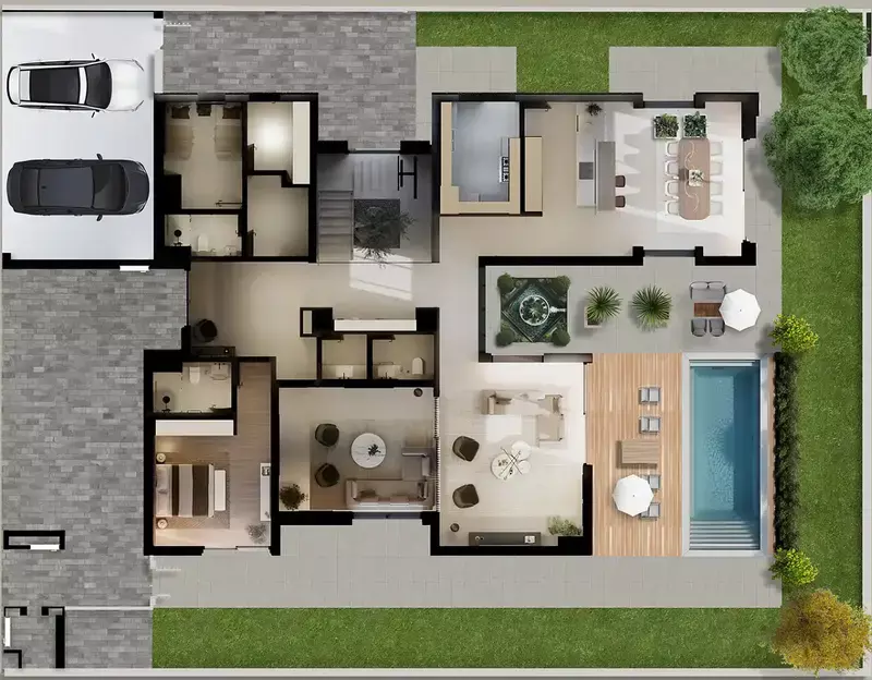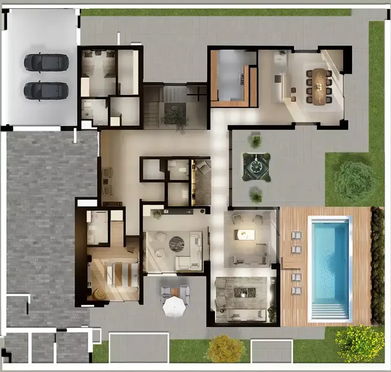 Serenity offers 153 villas in 3, 4, 5, and 6-bedroom layouts. The 3-bedroom villas are approximately 2,958 sqft, 4-bedroom villas range from 3,336 to 6,113 sqft, 5-bedroom villas are about 6,113 sqft, and 6-bedroom villas are approximately 9,224 sqft. Each villa features modern designs set amidst lush greenery and water features, providing a peaceful living environment.