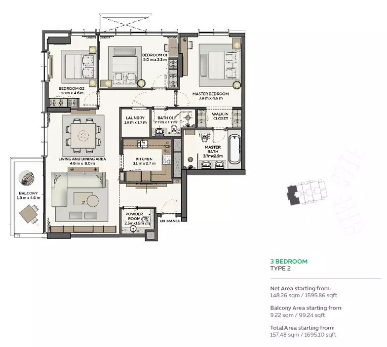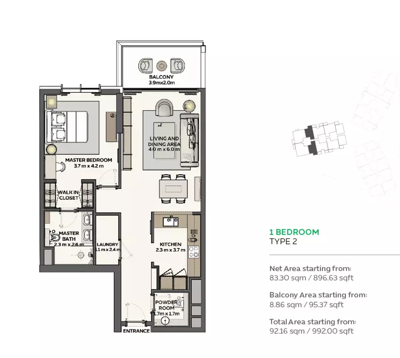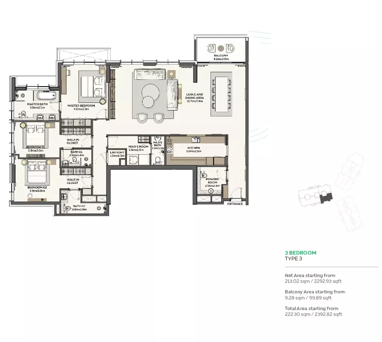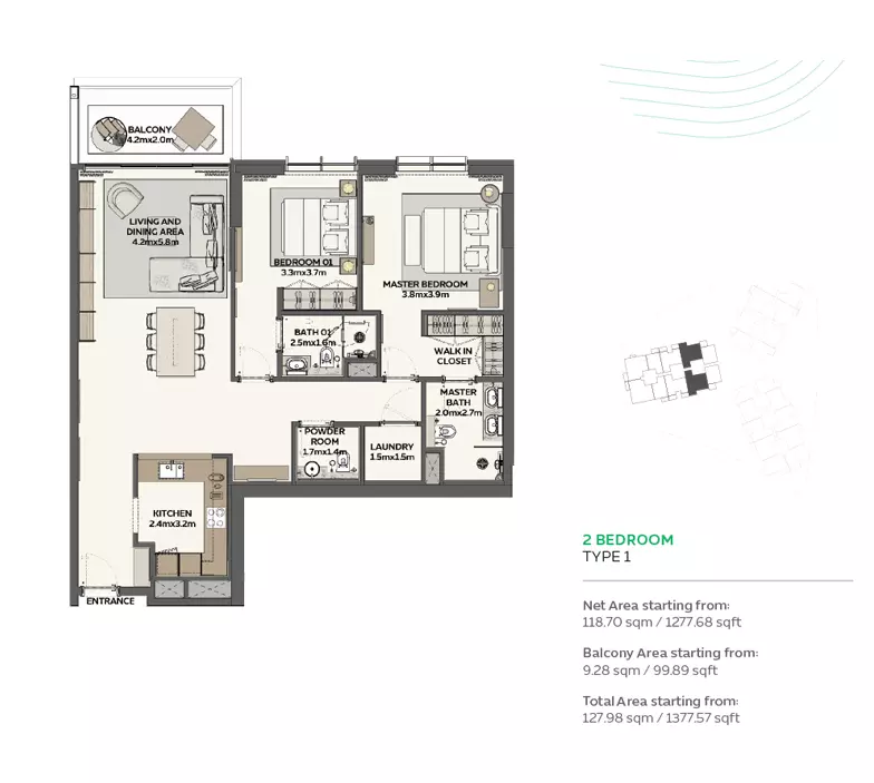 Sidr Residences offers a variety of apartment options with different sizes and prices: • 1 Bedroom Apartments: Ranging from 983 to 992 sqft, with prices starting from 1.9M AED • 2 Bedroom Apartments: Ranging from 1,377 to 1,425 sqft, with prices starting from 2.6M AED • 3 Bedroom Apartments: Ranging from 1,695 to 2,392 sqft, with prices starting from 3.3M AED • 4 Bedroom Apartments: 4,123 sqft, with prices starting from 8.5M AED These apartments are designed to cater to a range of family sizes and lifestyles, offering spacious layouts and modern amenities. The diverse unit options make Sidr Residences an attractive choice for buyers looking for comfort and luxury in Expo City.