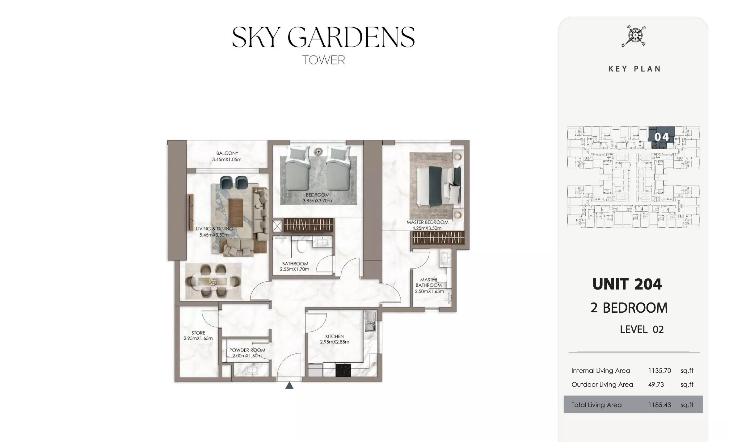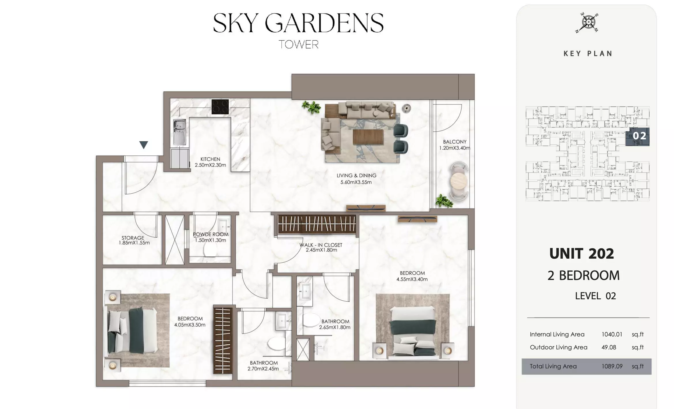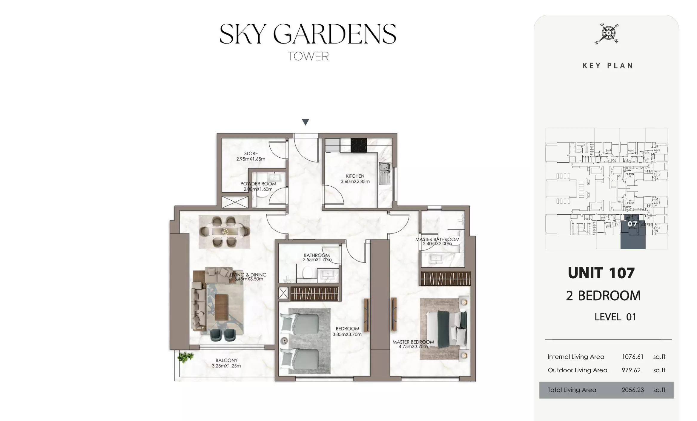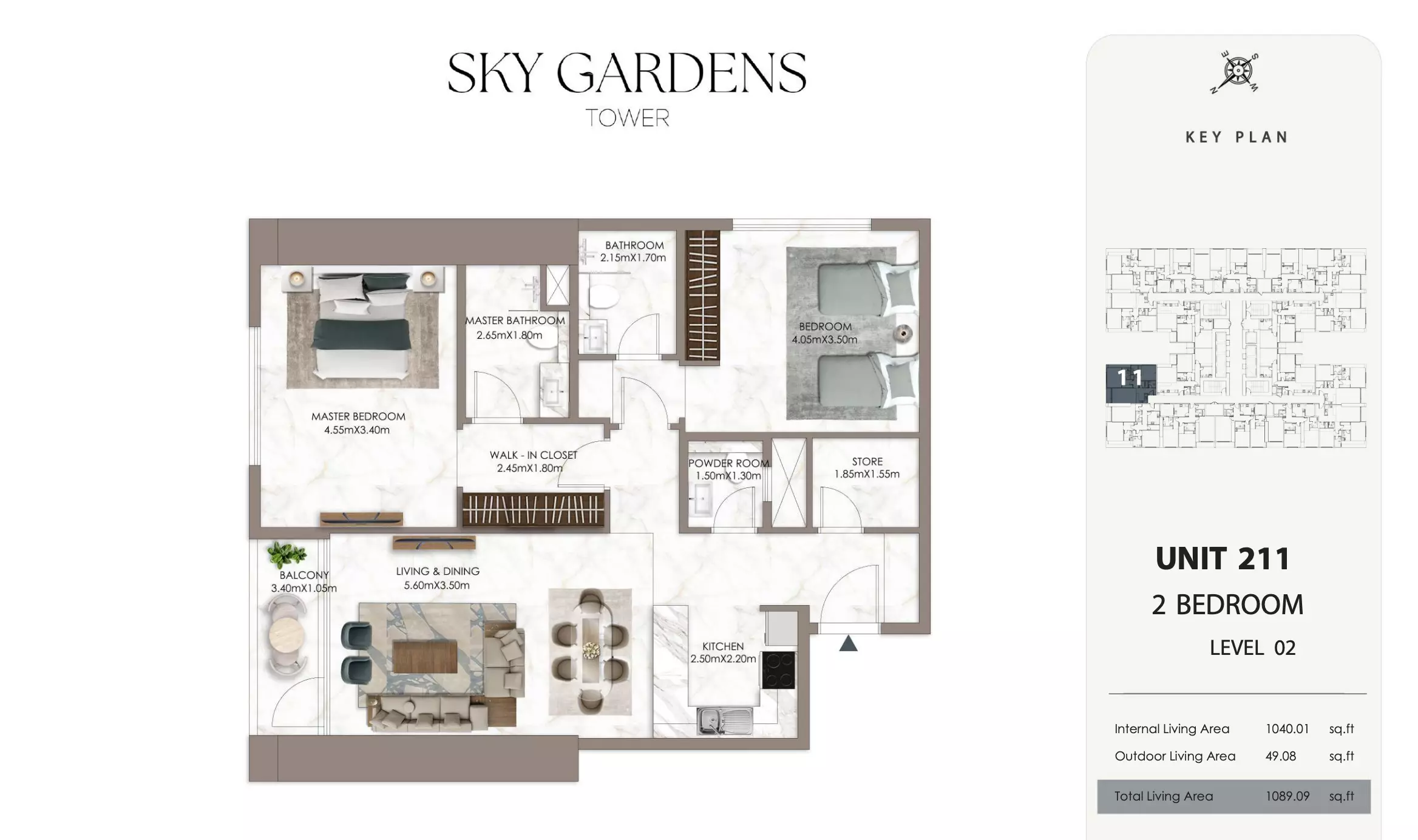 Sky Gardens Tower offers 2-bedroom apartments starting at 664K AED. These units have a spacious area of approximately 1,089 - 2056 square feet. The apartments provide a comfortable living space with modern design and efficient layouts suitable for families or professionals seeking a balance of space and affordability.