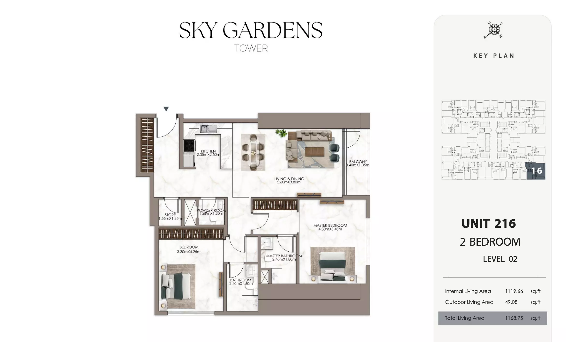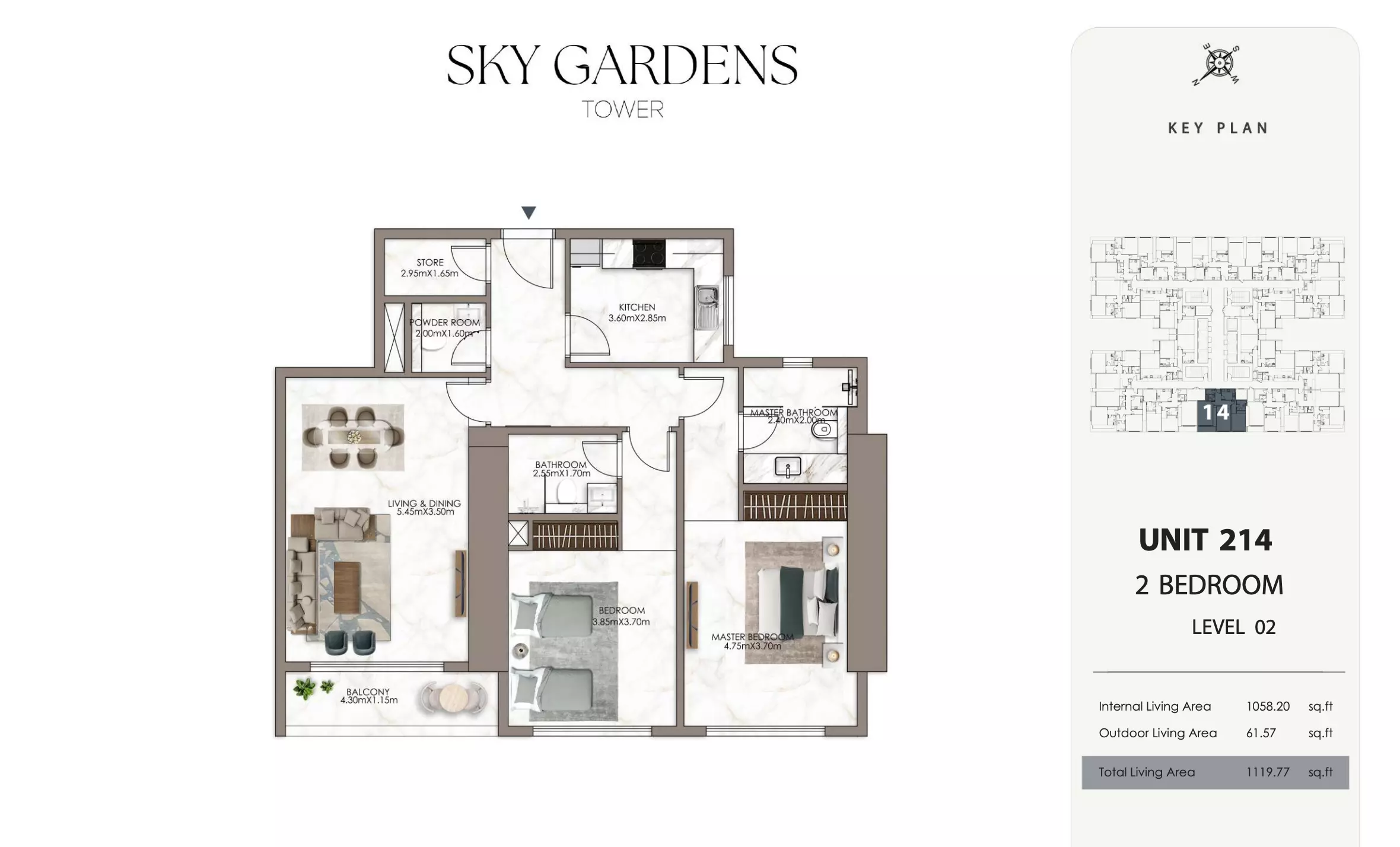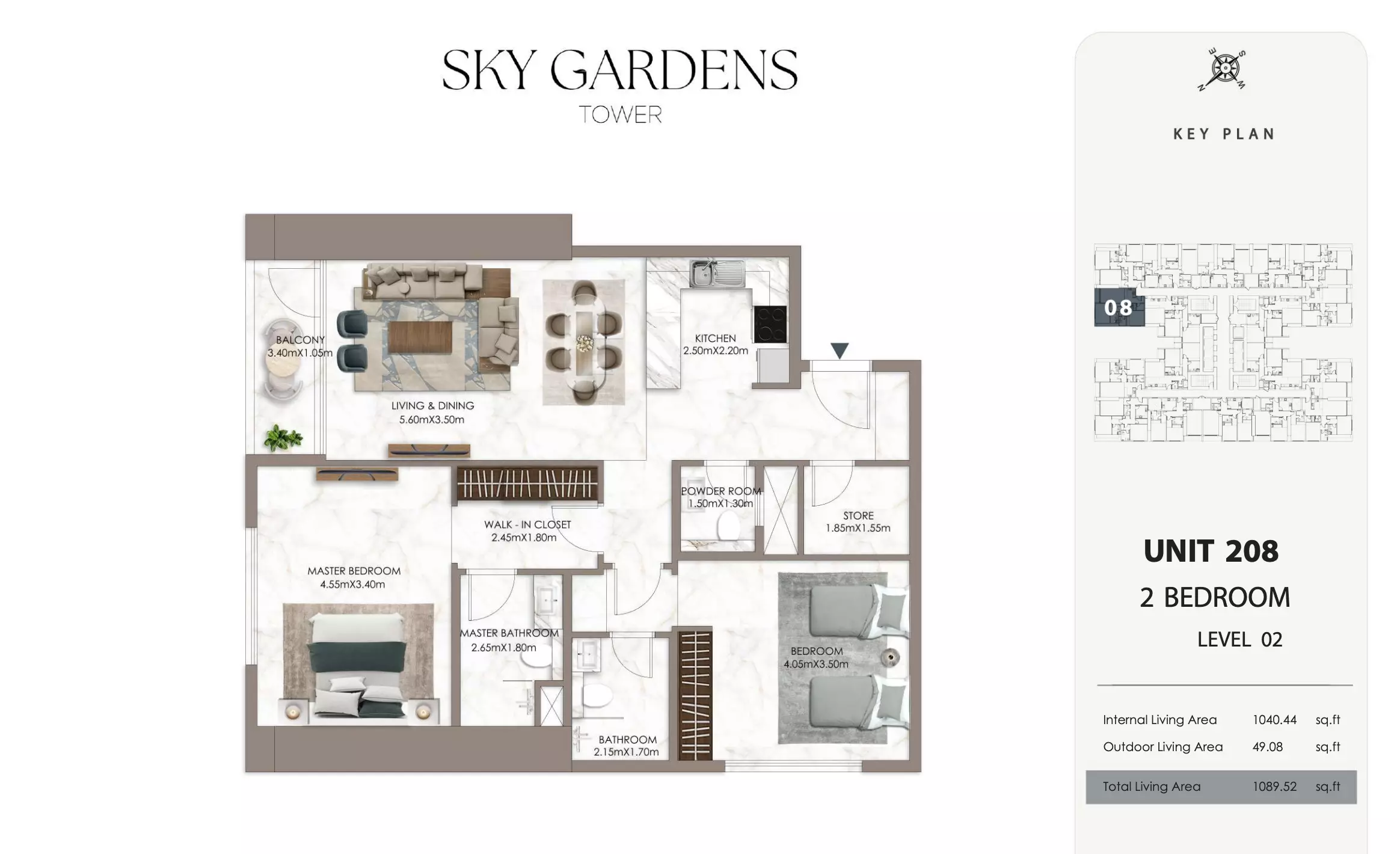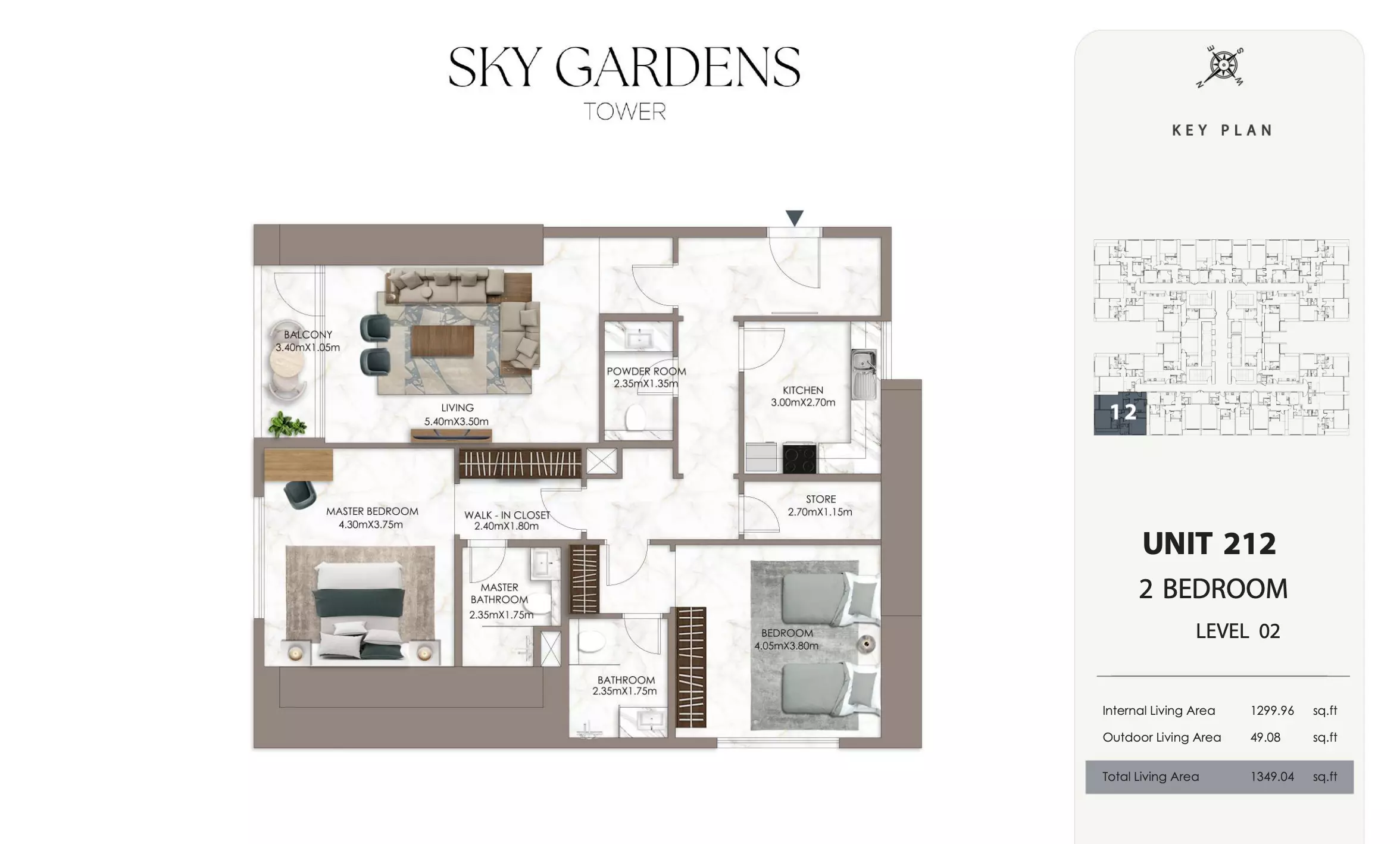 Sky Gardens Tower offers 2-bedroom apartments starting at 664K AED. These units have a spacious area of approximately 1,089 - 2056 square feet. The apartments provide a comfortable living space with modern design and efficient layouts suitable for families or professionals seeking a balance of space and affordability.