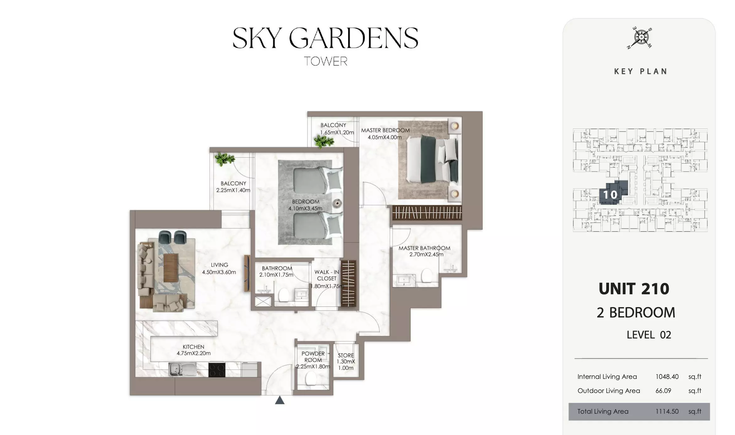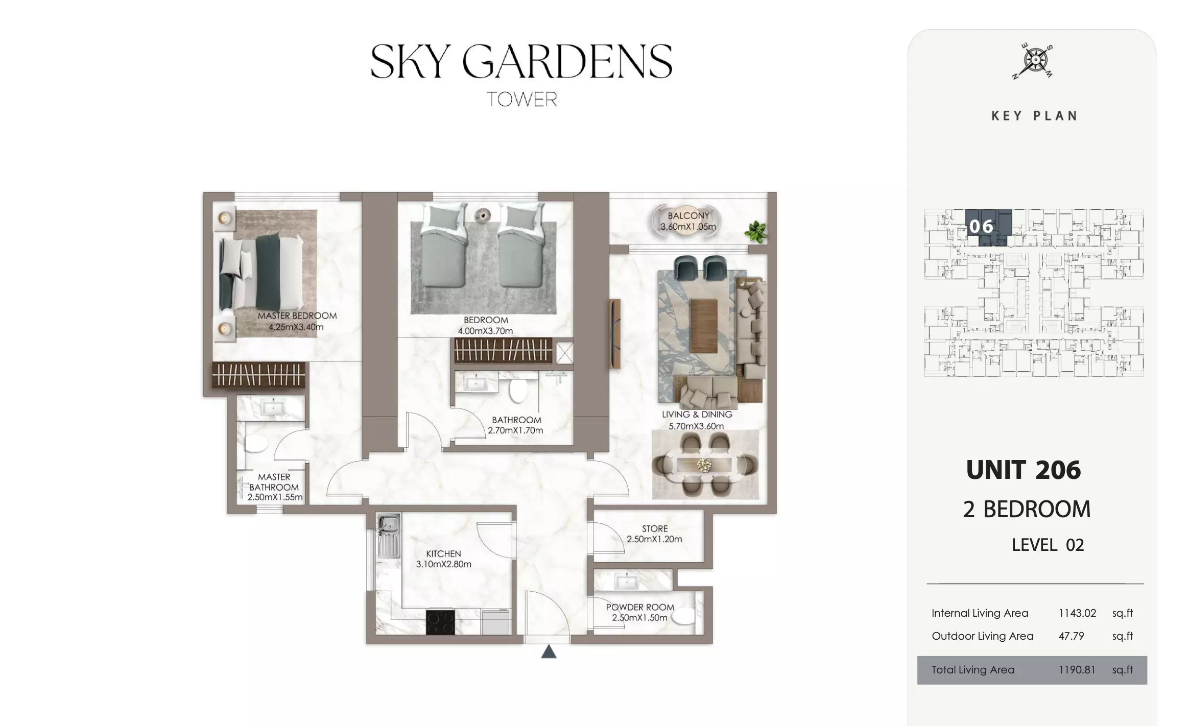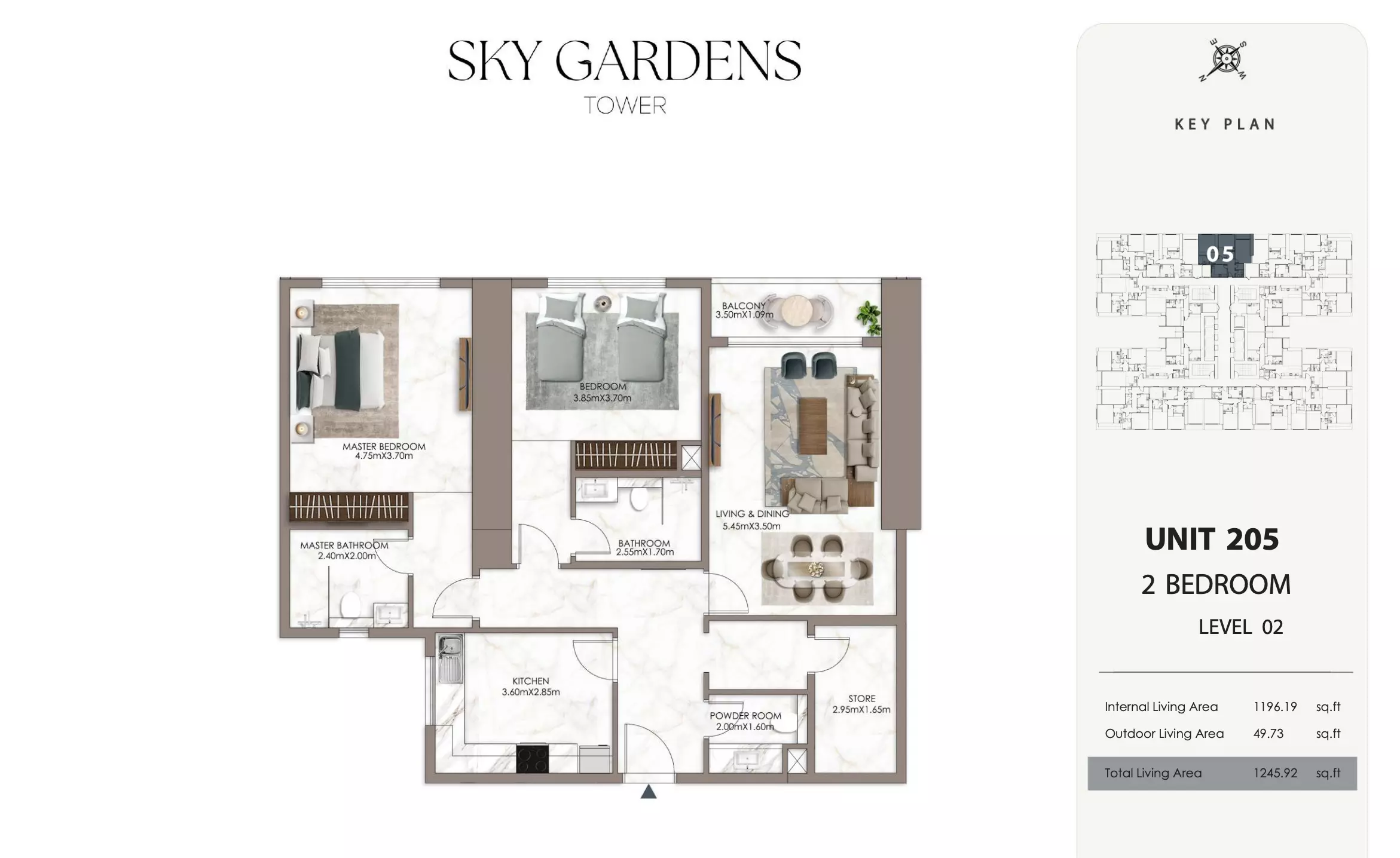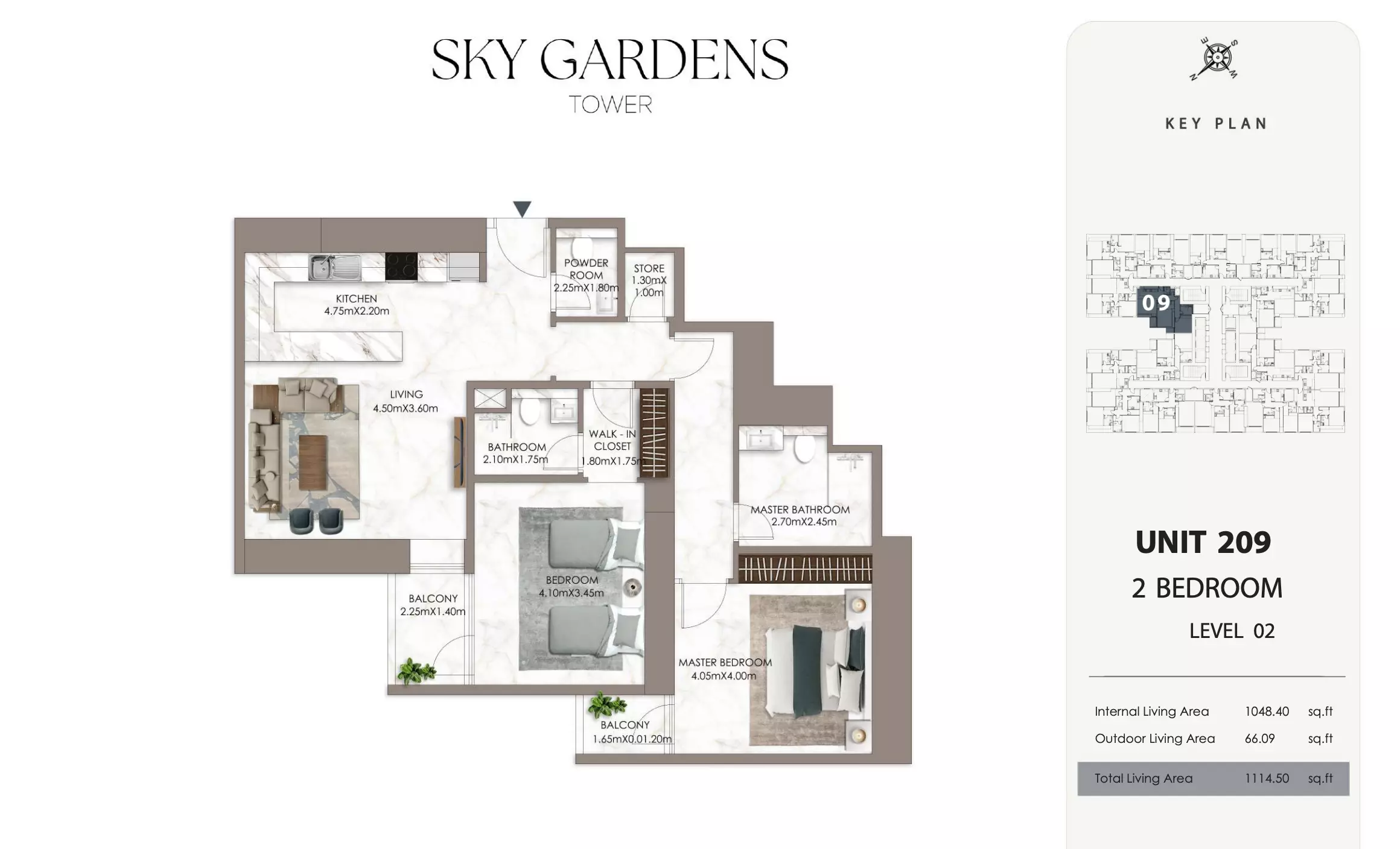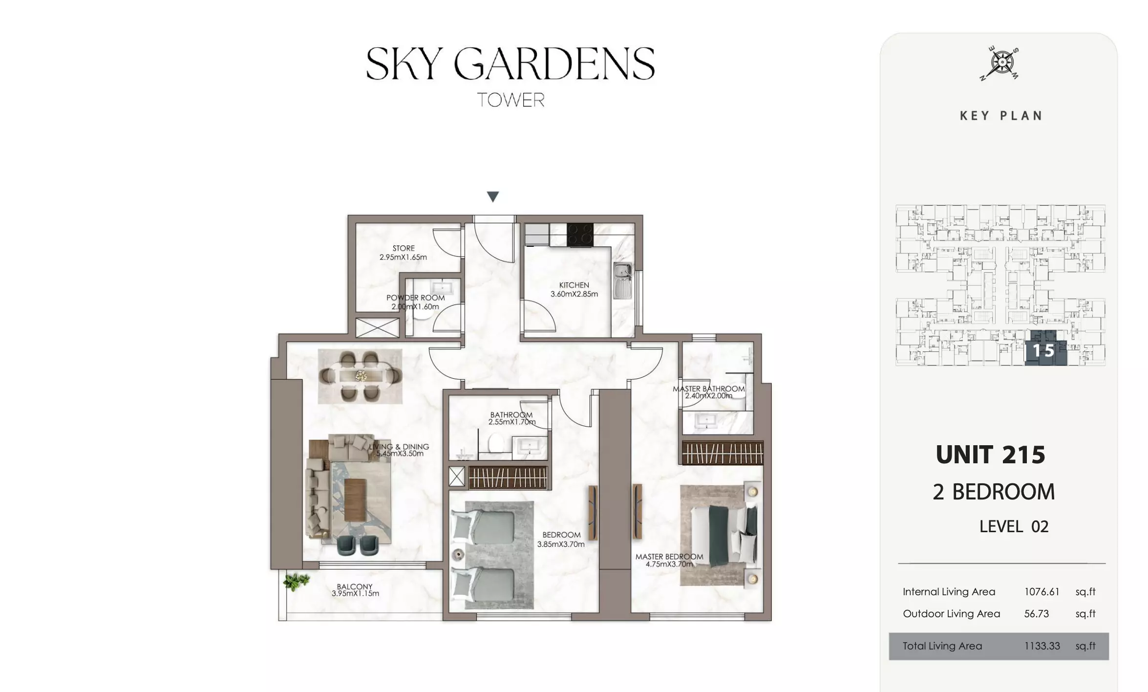 Sky Gardens Tower offers 2-bedroom apartments starting at 664K AED. These units have a spacious area of approximately 1,089 - 2056 square feet. The apartments provide a comfortable living space with modern design and efficient layouts suitable for families or professionals seeking a balance of space and affordability.