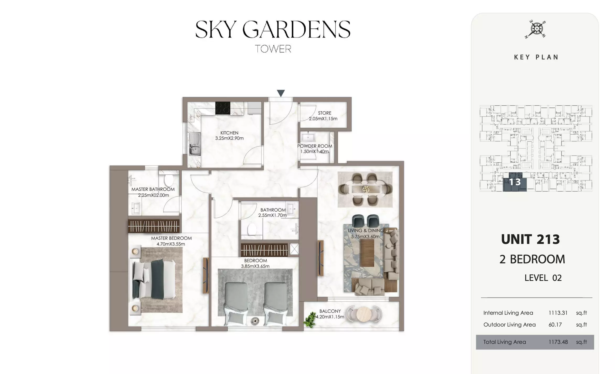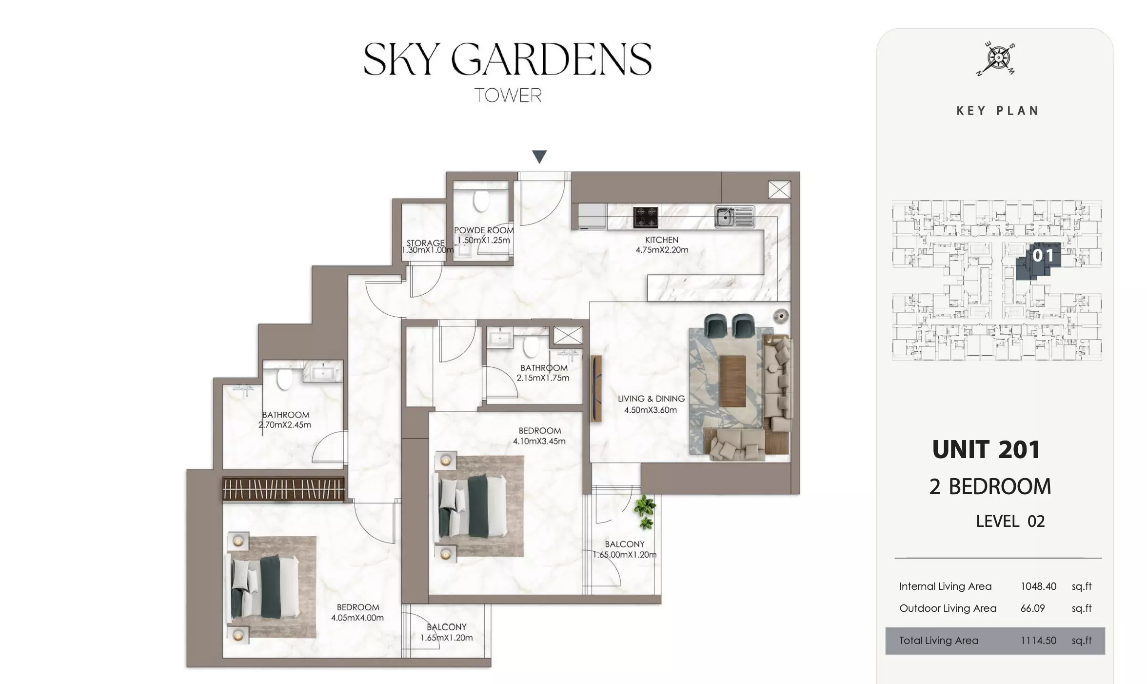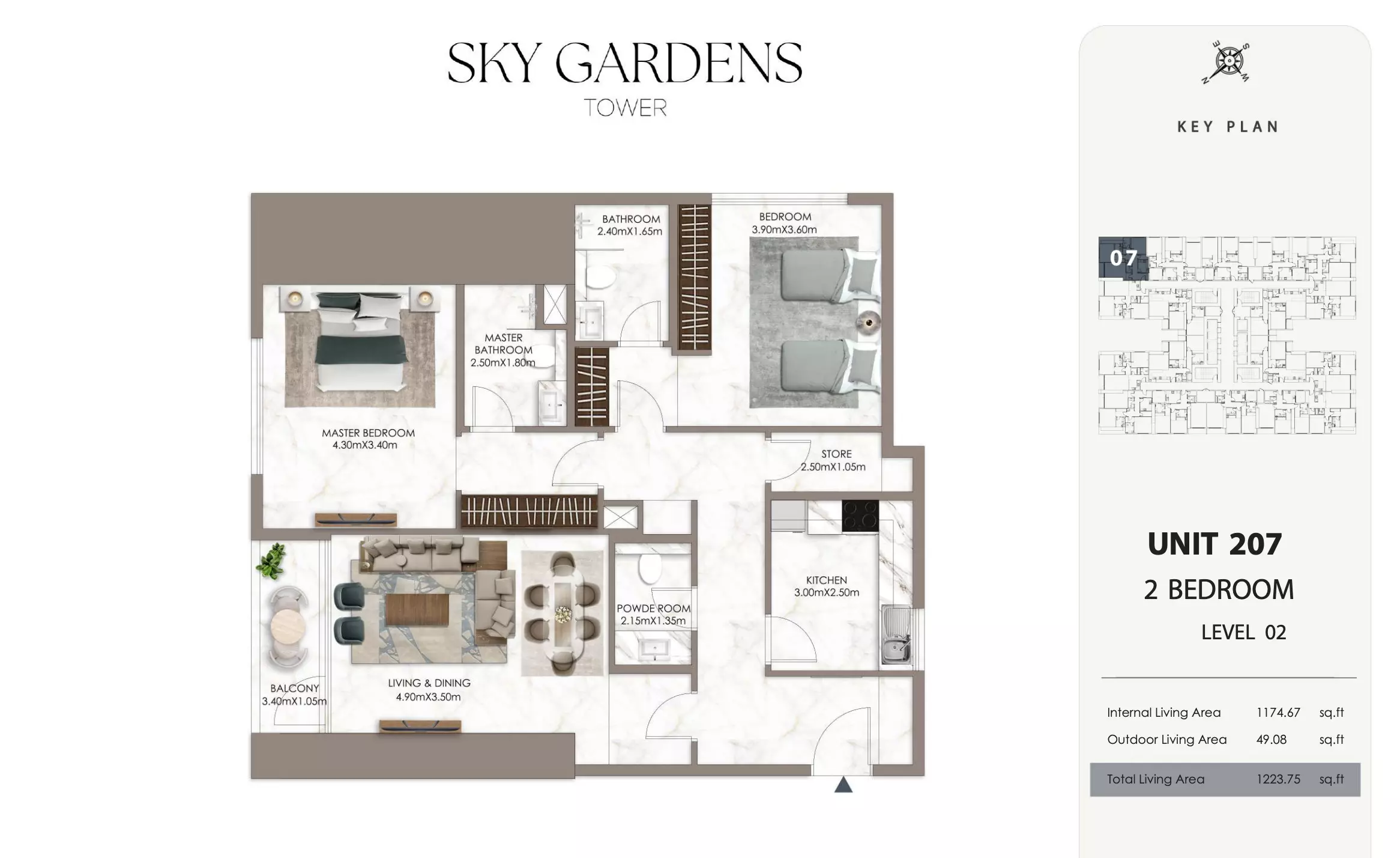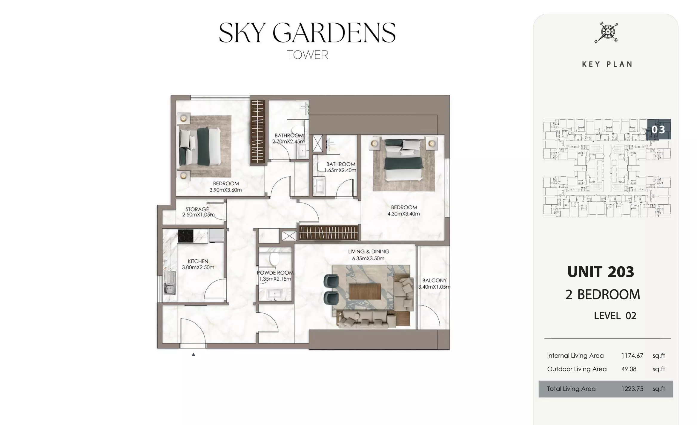 Sky Gardens Tower offers 2-bedroom apartments starting at 664K AED. These units have a spacious area of approximately 1,089 - 2056 square feet. The apartments provide a comfortable living space with modern design and efficient layouts suitable for families or professionals seeking a balance of space and affordability.
