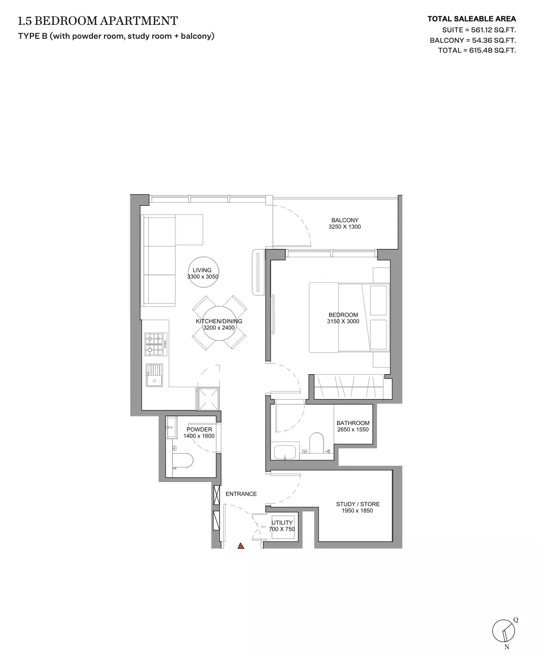 | Type B (With Powder Room, Study Room + Balcony) | 615.00 | View |