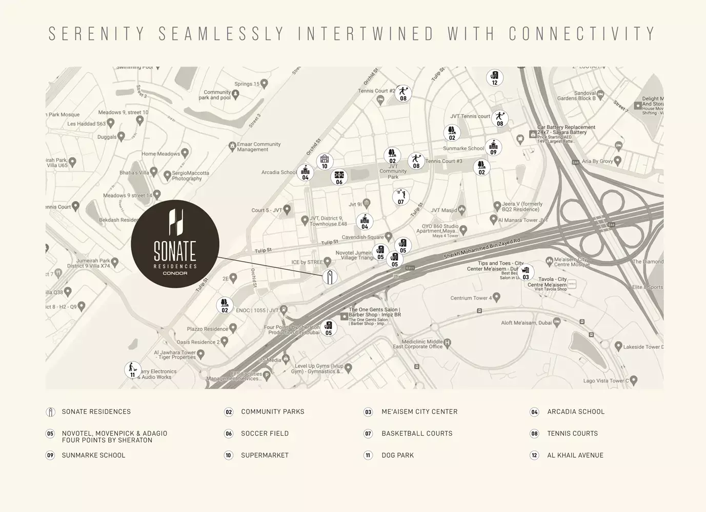 Sonate Residences offers a great investment opportunity, located in Jumeirah Village Triangle with easy access to major roads and attractions. The wellness-focused amenities and diverse unit types increase its appeal for both personal use and rental returns.