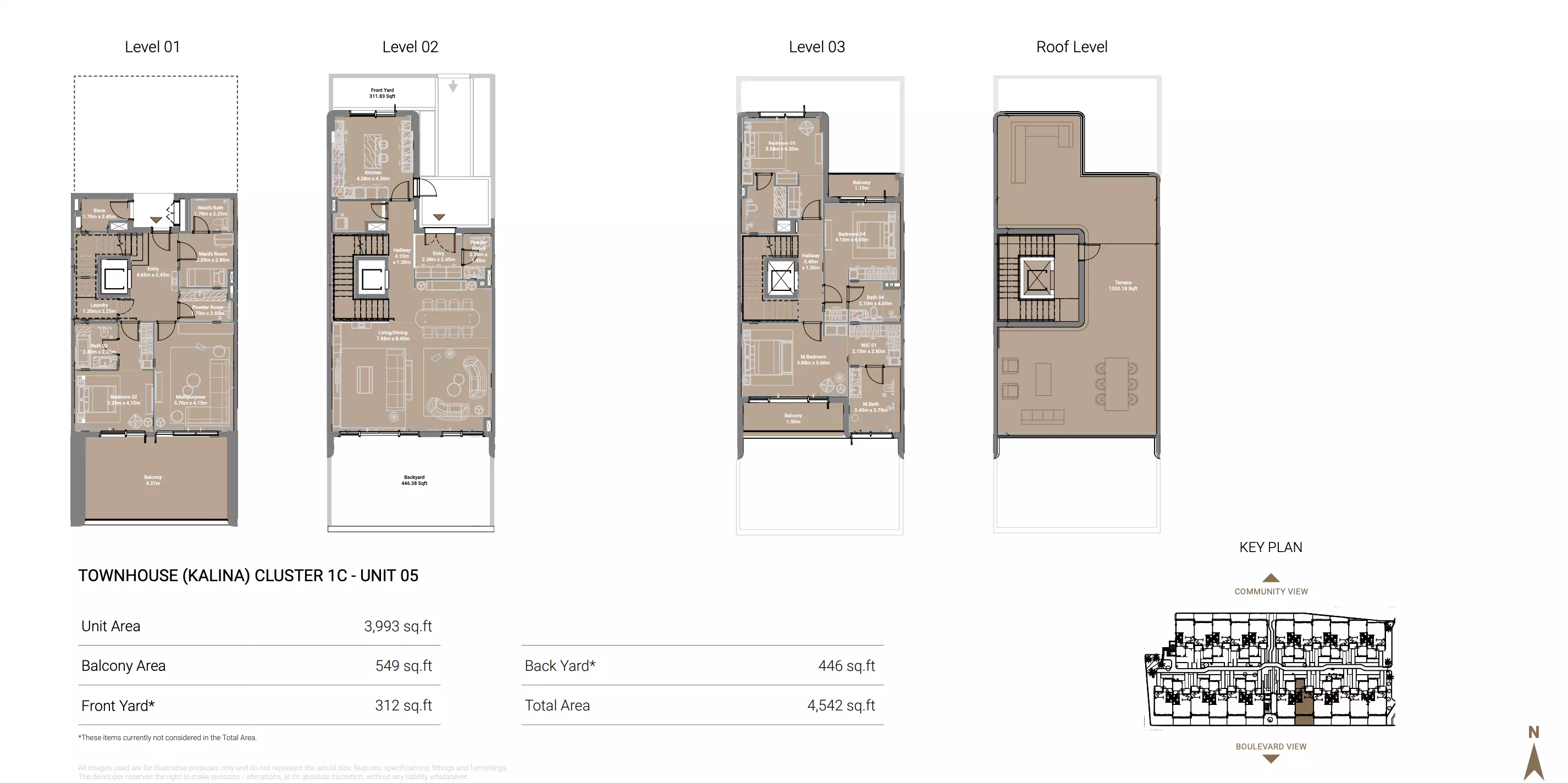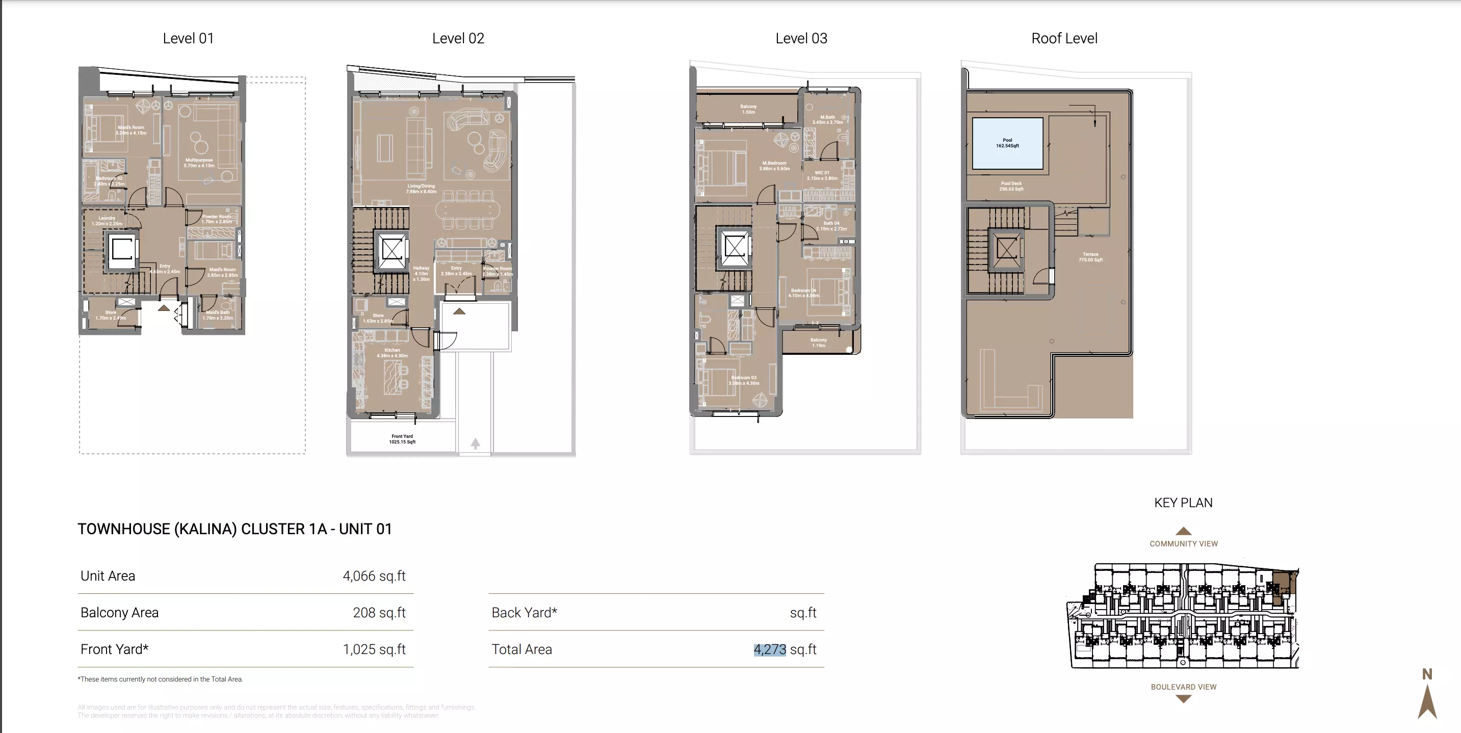 Takaya Kalina offers spacious townhouses designed for luxurious living. The available housing option includes: 4-bedroom townhouses, with sizes ranging from 4,273 to 4,542 sqft. These townhouses are built to provide ample living space and high-end finishes, ideal for families seeking comfort and style. The expansive layouts are complemented by premium features and modern amenities. Pricing details are not specified, and prospective buyers can inquire for further information. This development promises an exclusive and elevated lifestyle, with each townhouse designed to meet the needs of discerning homeowners.