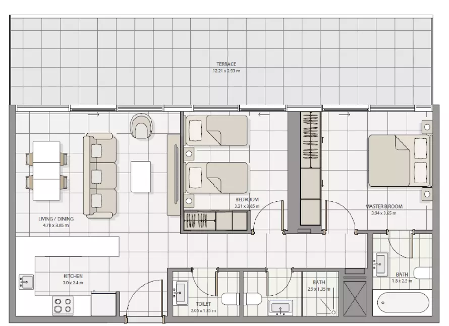 • 2 Bedroom Apartments: Suited for small families or those who need an extra room for a home office.