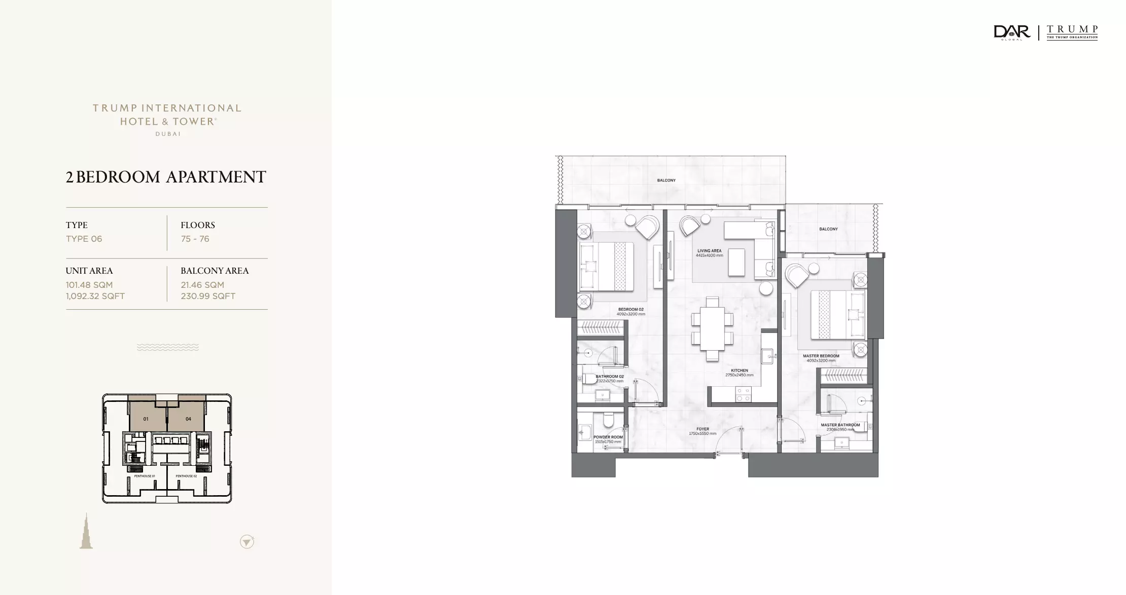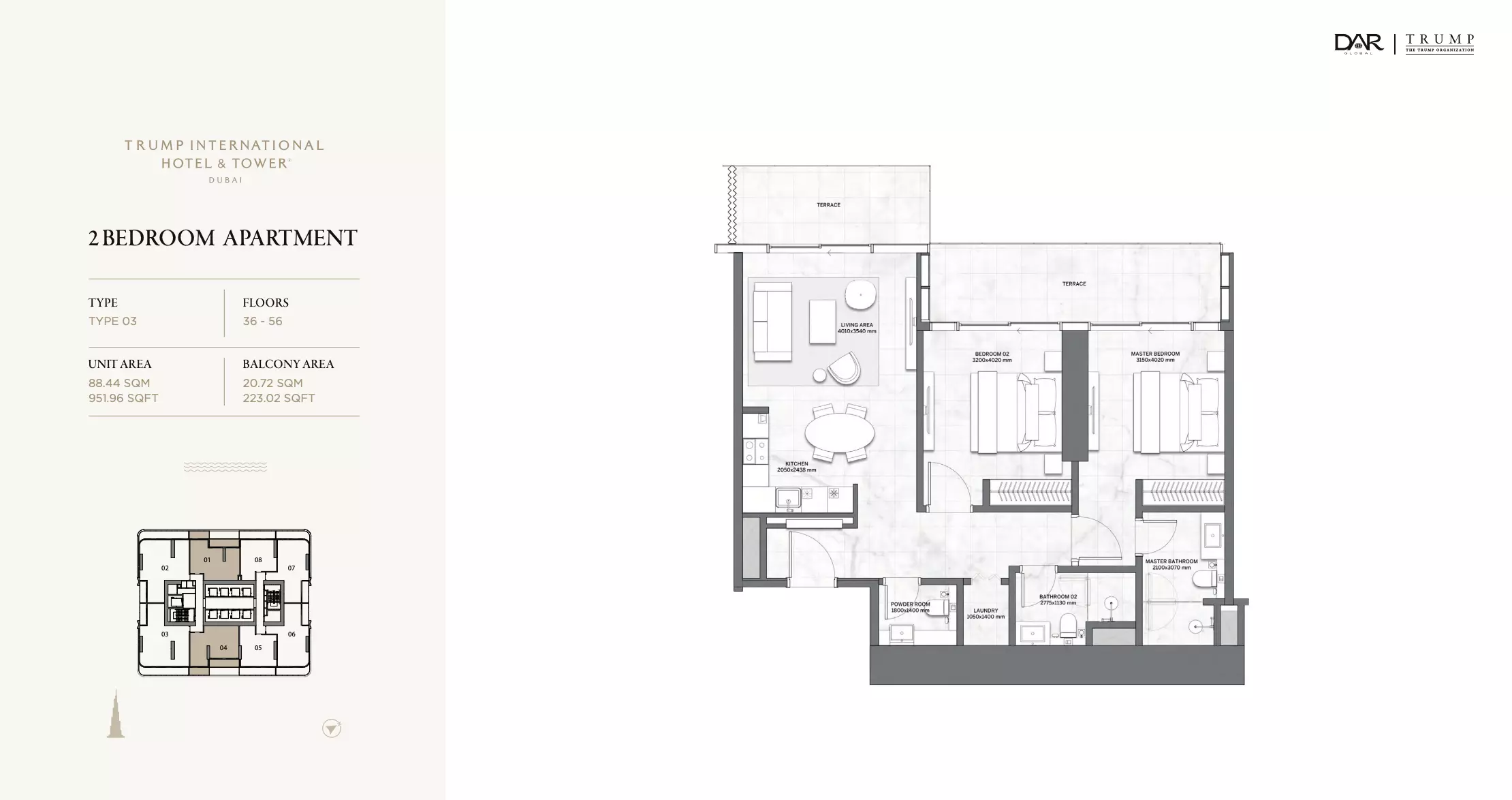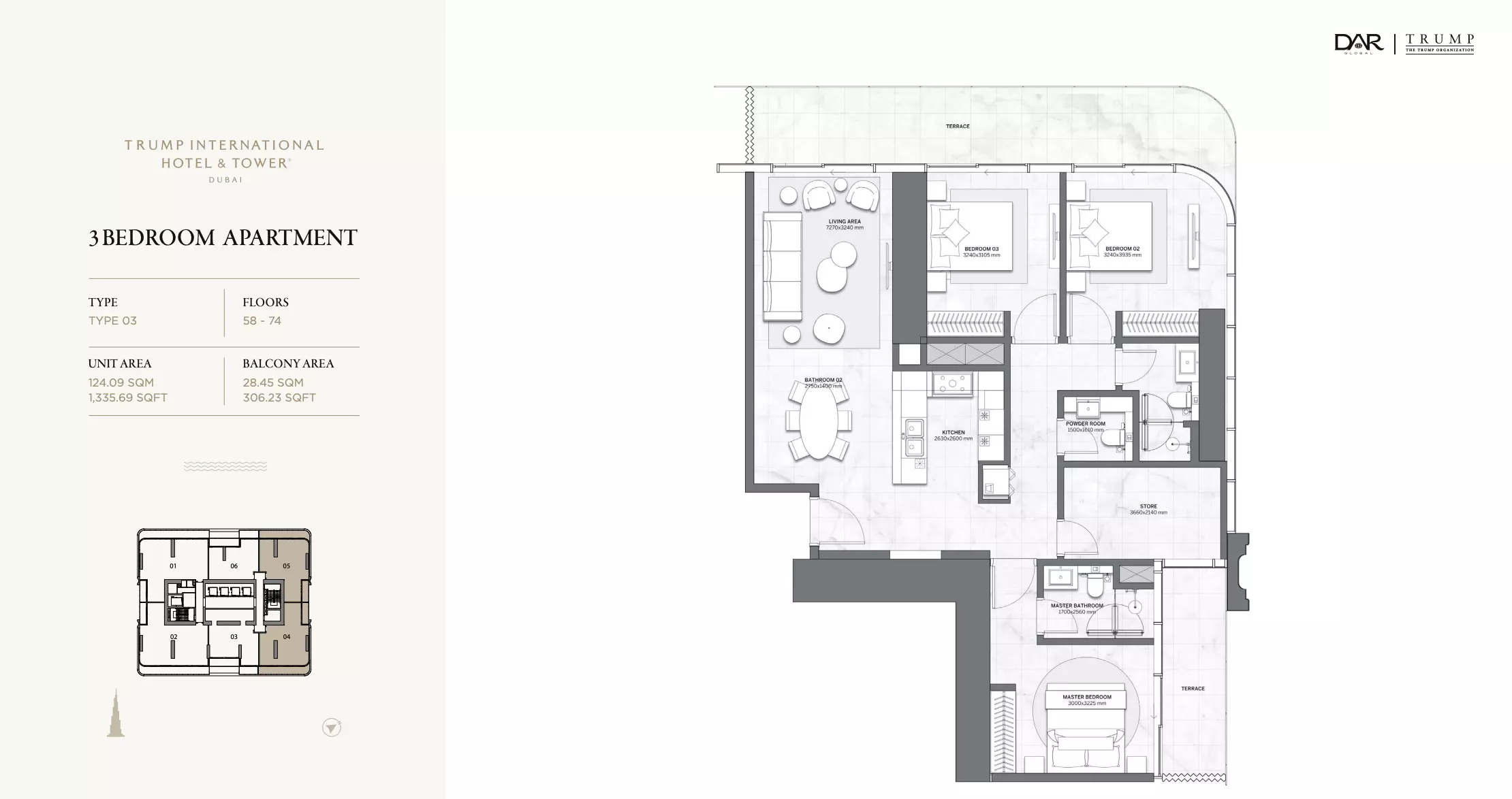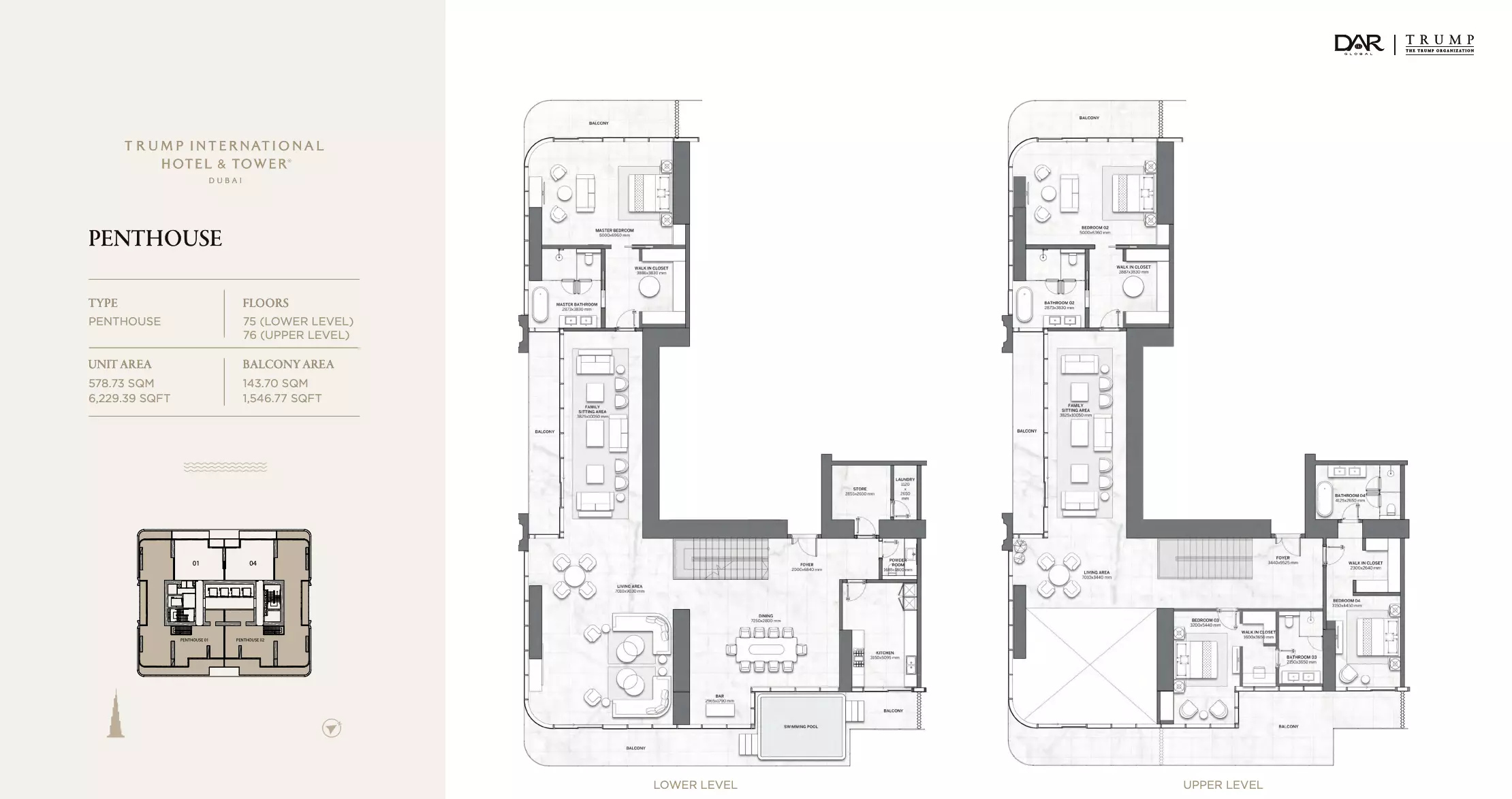 Trump International Hotel & Tower Dubai offers a range of luxurious residential units designed for sophisticated urban living. The property includes spacious 2-bedroom and 3-bedroom apartments, as well as exclusive 4-bedroom penthouses. The 2-bedroom apartments range from 951 to 1,368 square feet, providing comfortable living spaces ideal for professionals and small families. The 3-bedroom units are larger, between 1,335 and 1,777 square feet, offering more room for growing families or those seeking extra space. For those seeking ultimate luxury, the 4-bedroom penthouses span an impressive 6,229 square feet, featuring expansive layouts and premium finishes. These options reflect the tower’s commitment to elegance, comfort, and exclusivity in Dubai’s prime locations.