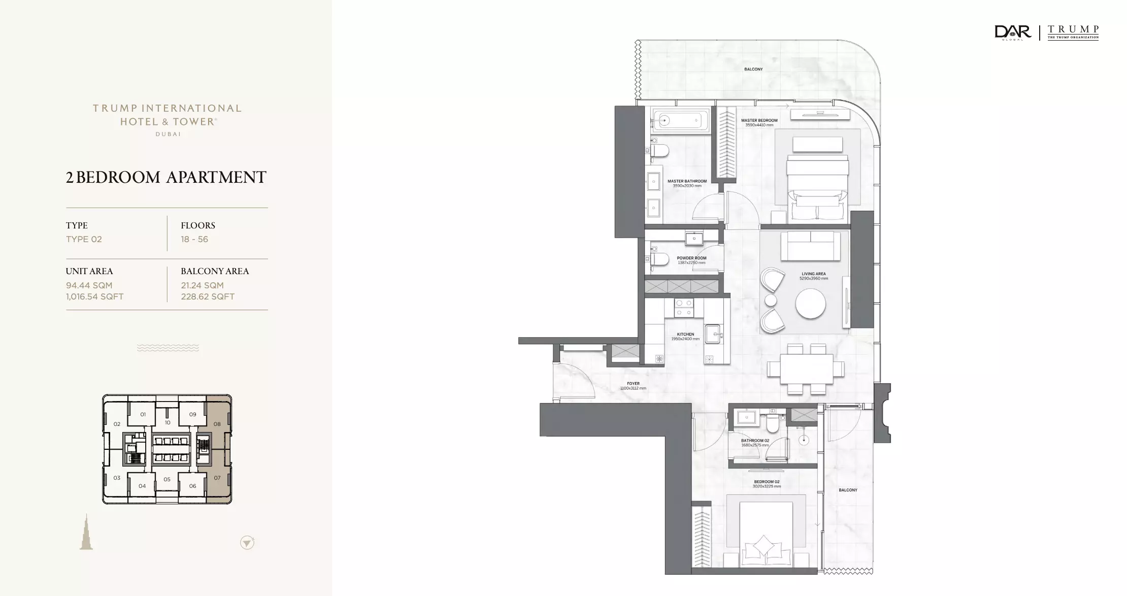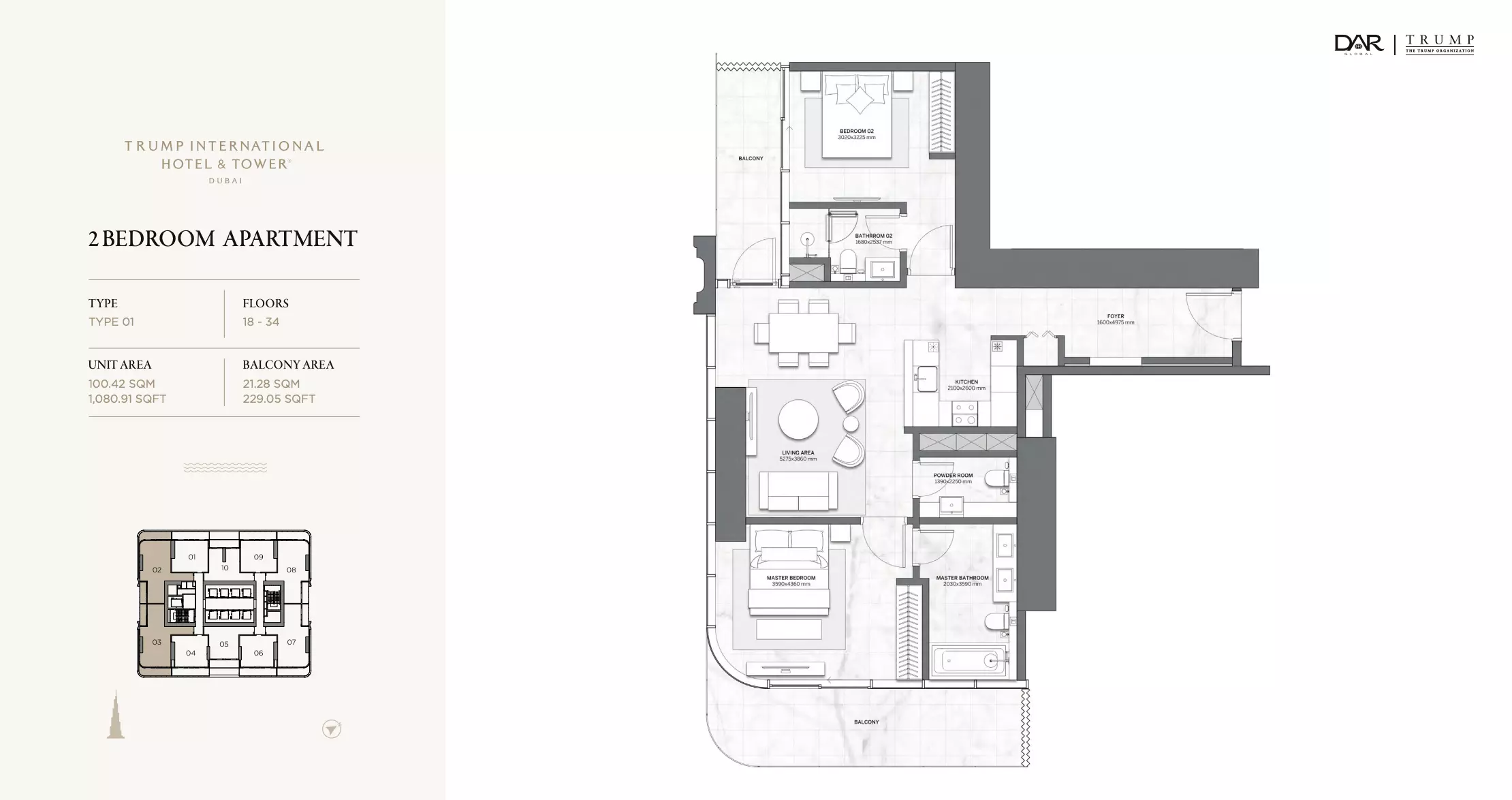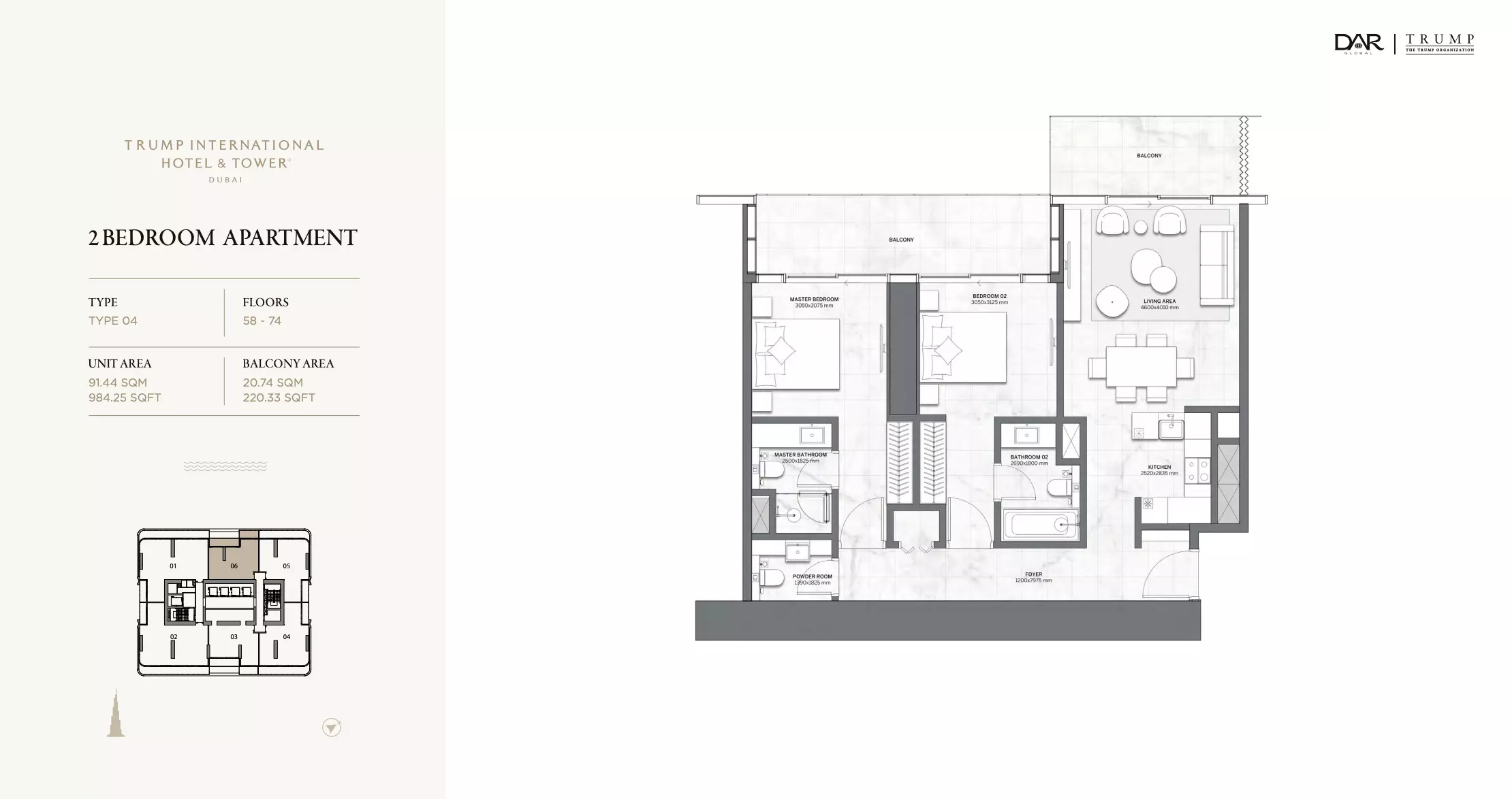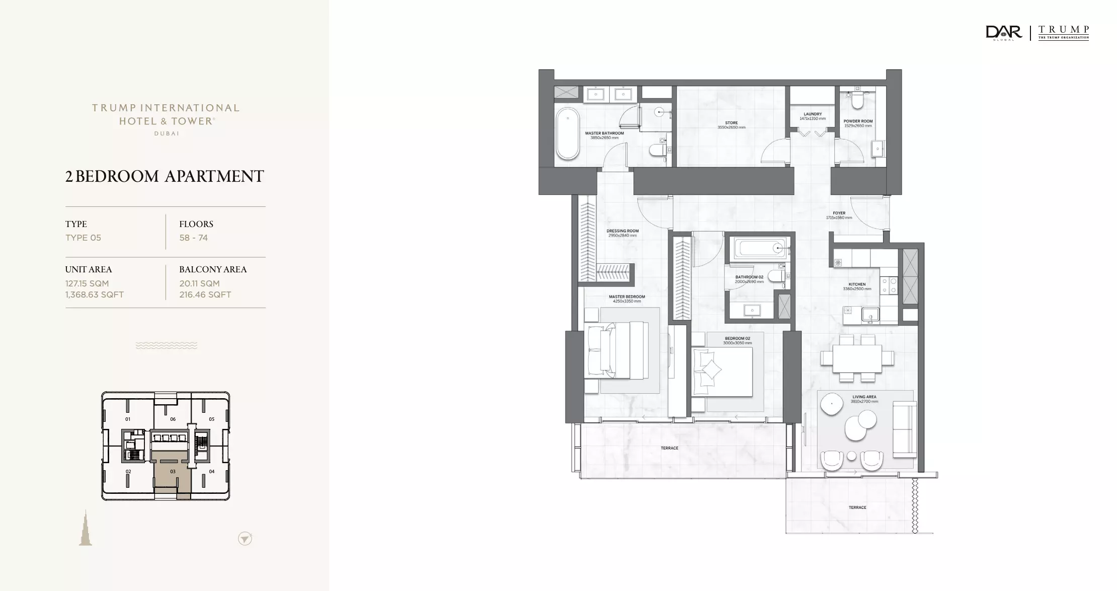 Trump International Hotel & Tower Dubai represents a strong investment opportunity due to its prime location on Sheikh Zayed Road, exceptional amenities, and world-class design. As the first Trump International Hotel in the Middle East, it offers fully furnished residences with breathtaking skyline views, a rooftop pool, a modern gym, and a dedicated children's playground. Developed by Dar Global, the 80-floor tower provides easy access to major city routes and is backed by the globally recognized Trump Hotels brand, known for delivering extraordinary service and luxury experiences.