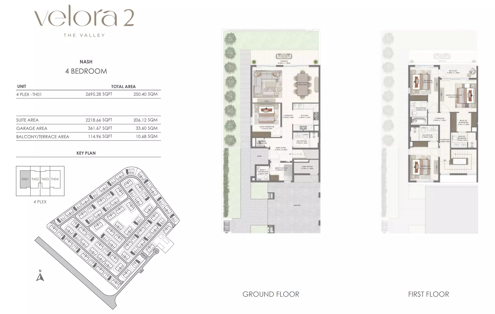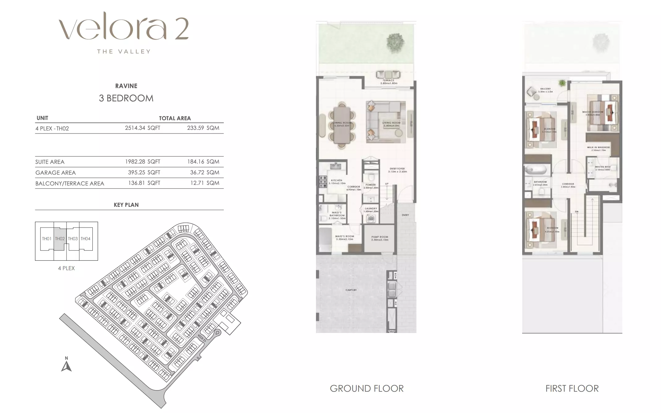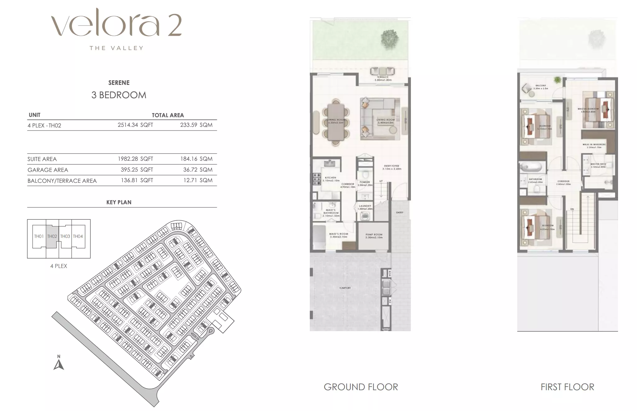 Velora 2 offers spacious townhouse options designed for comfortable living. The available units include: 3-bedroom townhouses ranging from 2,456 to 2,514 square feet, ideal for families seeking a balance of space and luxury in a well-connected area. 4-bedroom townhouses ranging from 2,695 to 2,731 square feet, providing more expansive living areas with additional rooms for larger families or those desiring extra space for work and recreation. These townhouses combine modern design with ample living space, ensuring a premium lifestyle in a growing community within The Valley, Dubai.