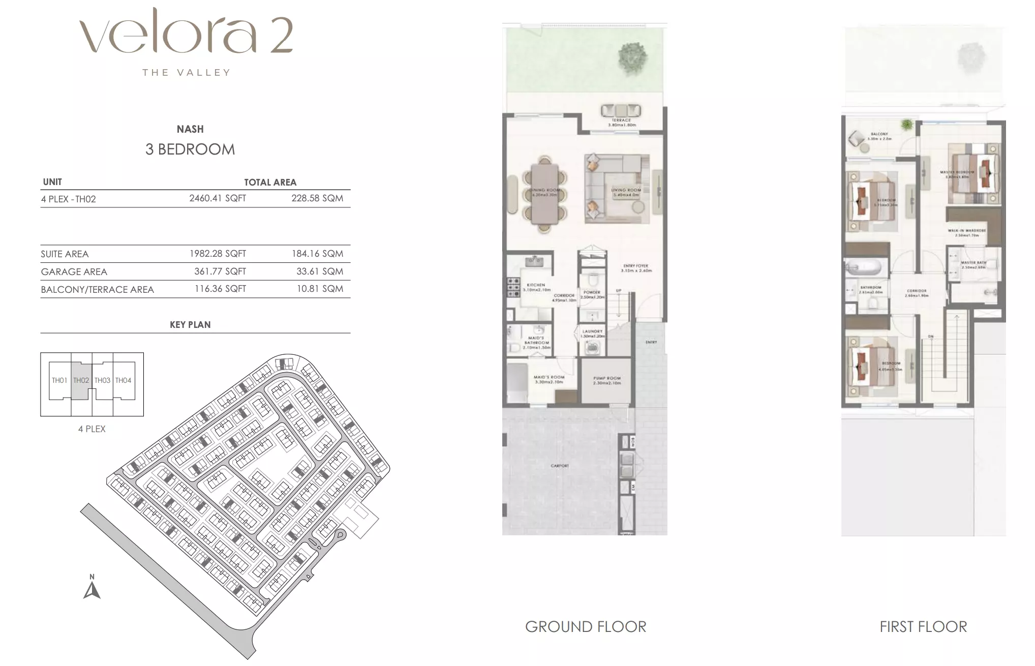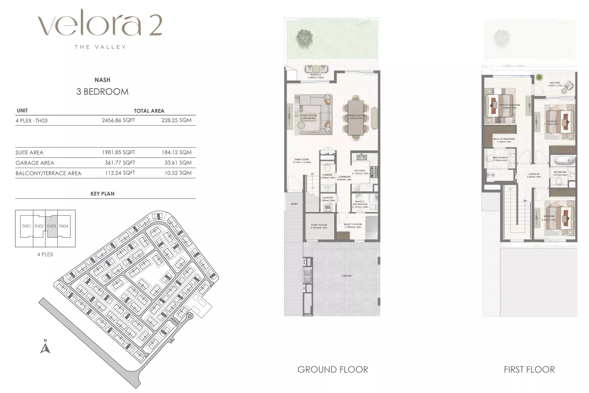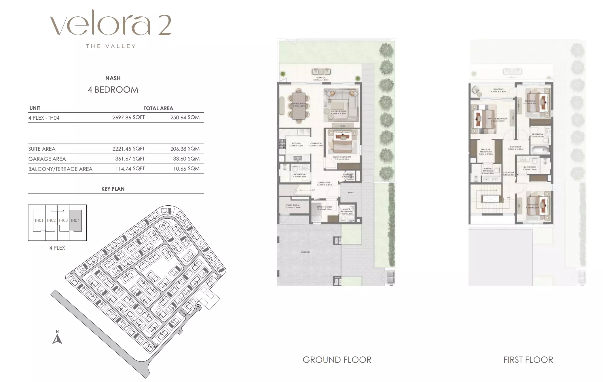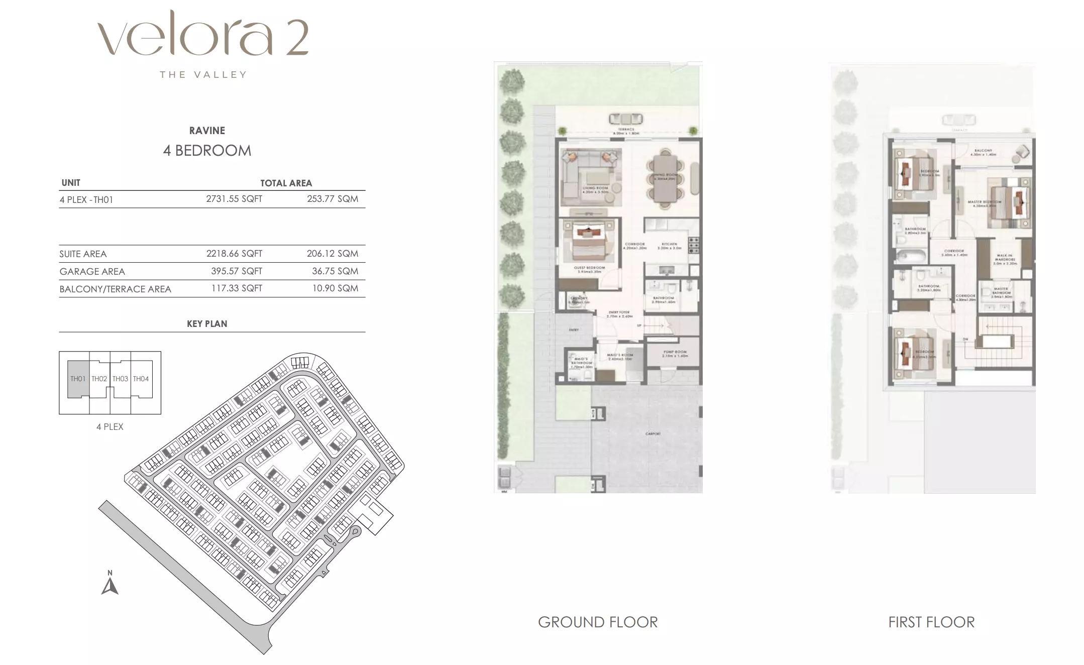 Velora 2 offers spacious townhouse options designed for comfortable living. The available units include: 3-bedroom townhouses ranging from 2,456 to 2,514 square feet, ideal for families seeking a balance of space and luxury in a well-connected area. 4-bedroom townhouses ranging from 2,695 to 2,731 square feet, providing more expansive living areas with additional rooms for larger families or those desiring extra space for work and recreation. These townhouses combine modern design with ample living space, ensuring a premium lifestyle in a growing community within The Valley, Dubai.