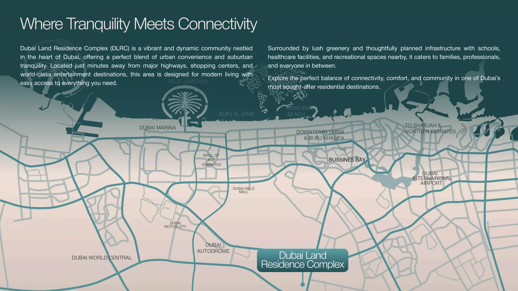 Verdan1a 1 represents a strong investment opportunity due to its strategic location in the Dubai Land Residence Complex (DLRC). The development emphasizes sustainability, luxury, and innovation, catering to residents seeking a harmonious lifestyle. Its proximity to major highways and key landmarks ensures seamless connectivity throughout Dubai, enhancing its investment appeal.