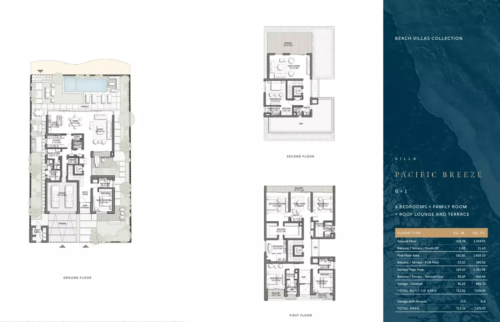 Villa Pacific Breeze offers a luxurious six-bedroom villa with a total area of 7,676 sqft. The villa features spacious living areas, ensuite bathrooms for each bedroom, an open-plan layout, floor-to-ceiling windows, and a rooftop lounge with panoramic views. The design seamlessly blends contemporary architecture with natural elements, providing a sophisticated and comfortable living environment.
