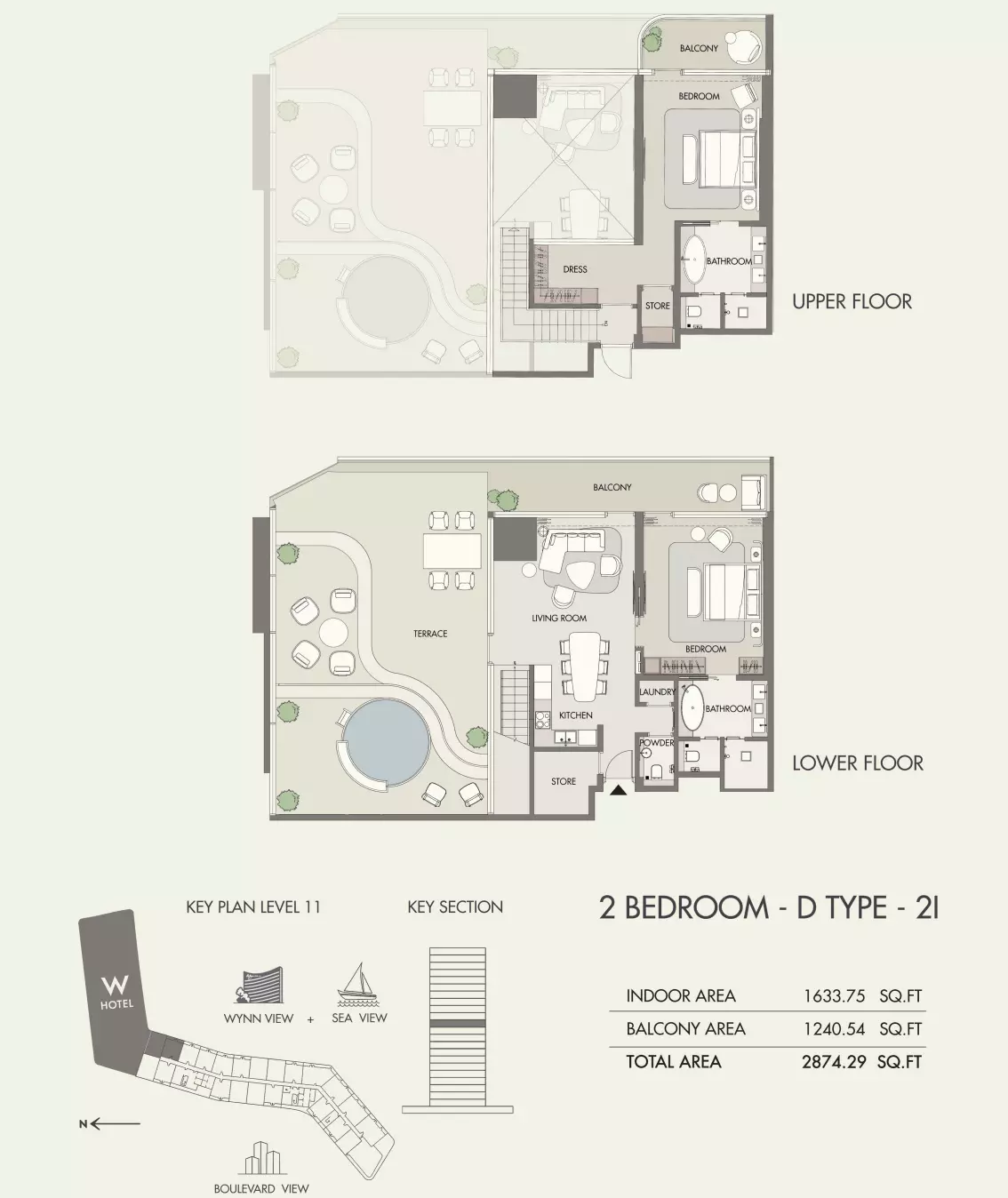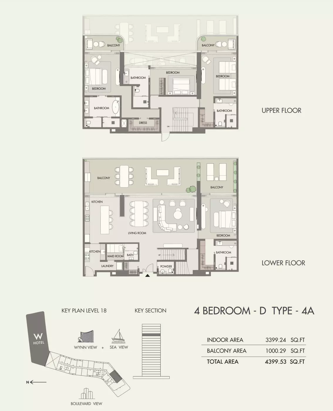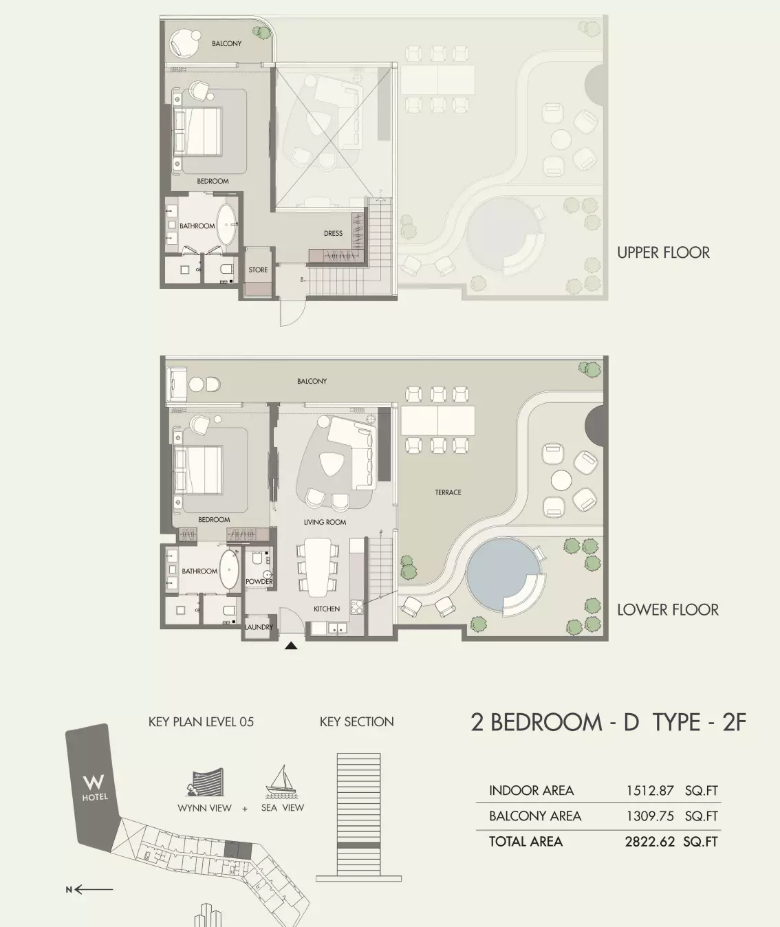 W Hotel & Residences offers a variety of luxurious living options, ranging from one-bedroom apartments to expansive multi-bedroom duplexes. One-bedroom apartments start from 4.1 million AED, with sizes between 1,087 and 1,600 square feet, offering stylish and functional layouts for singles or couples. Two-bedroom units are available from 6.6 million AED, spanning 1,606 to 1,984 square feet, providing ample space for families. Larger four-bedroom apartments cover 4,339 square feet, delivering generous living areas and premium finishes. The development also features duplex options, including two-bedroom units from 12 million AED measuring 1,865 to 3,051 square feet, and three-bedroom duplexes starting at 19 million AED with sizes ranging from 4,514 to 6,830 square feet, ideal for residents seeking unparalleled space and luxury.