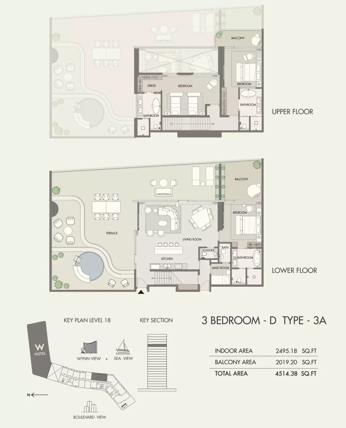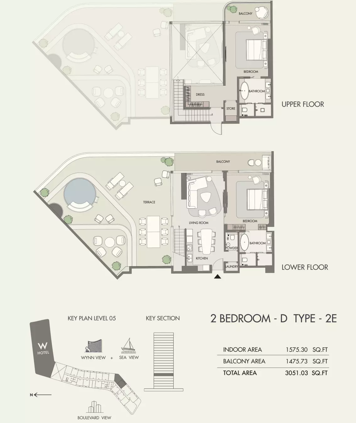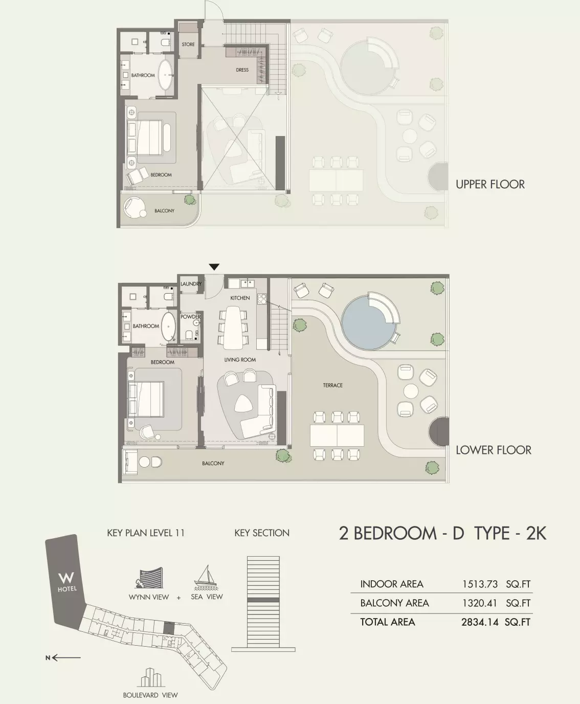 W Hotel & Residences offers a variety of luxurious living options, ranging from one-bedroom apartments to expansive multi-bedroom duplexes. One-bedroom apartments start from 4.1 million AED, with sizes between 1,087 and 1,600 square feet, offering stylish and functional layouts for singles or couples. Two-bedroom units are available from 6.6 million AED, spanning 1,606 to 1,984 square feet, providing ample space for families. Larger four-bedroom apartments cover 4,339 square feet, delivering generous living areas and premium finishes. The development also features duplex options, including two-bedroom units from 12 million AED measuring 1,865 to 3,051 square feet, and three-bedroom duplexes starting at 19 million AED with sizes ranging from 4,514 to 6,830 square feet, ideal for residents seeking unparalleled space and luxury.
