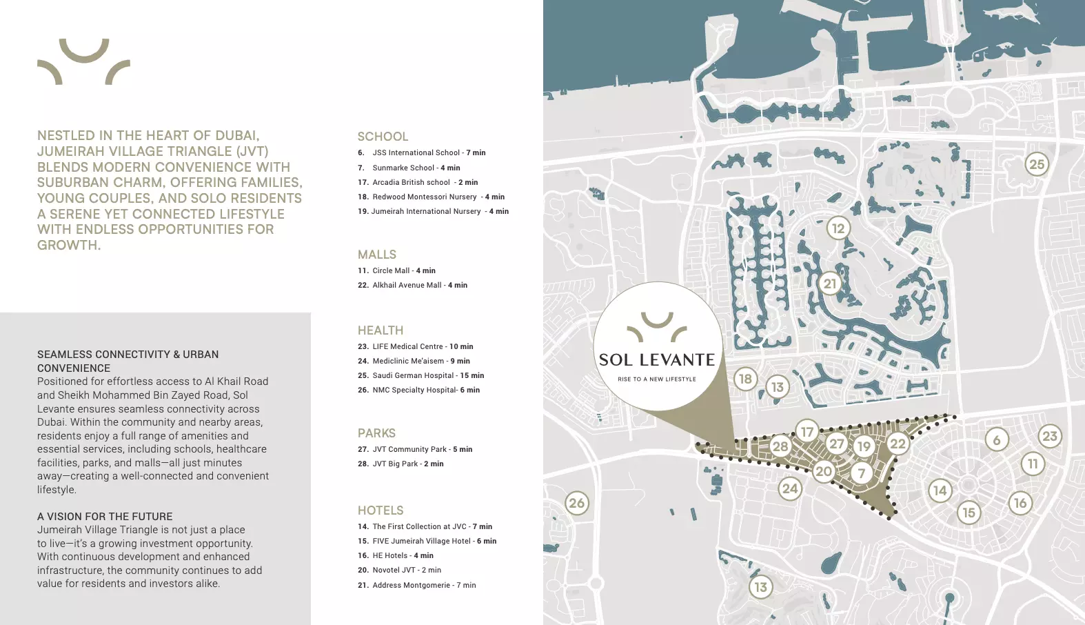 سول لوانته فرصت سرمایهگذاری قوی را ارائه میدهد و تجربهای مسکونی با تمرکز بر سلامتی را در موقعیت مکانی عالی جمیرا ویلج مثلث ارائه میدهد. تأکید این پروژه بر ترکیب طبیعت، سلامتی و لوکس بودن، همراه با امکانات رفاهی گسترده آن، پتانسیل افزایش قابل توجه سرمایه و بازده اجاره را نشان میدهد.