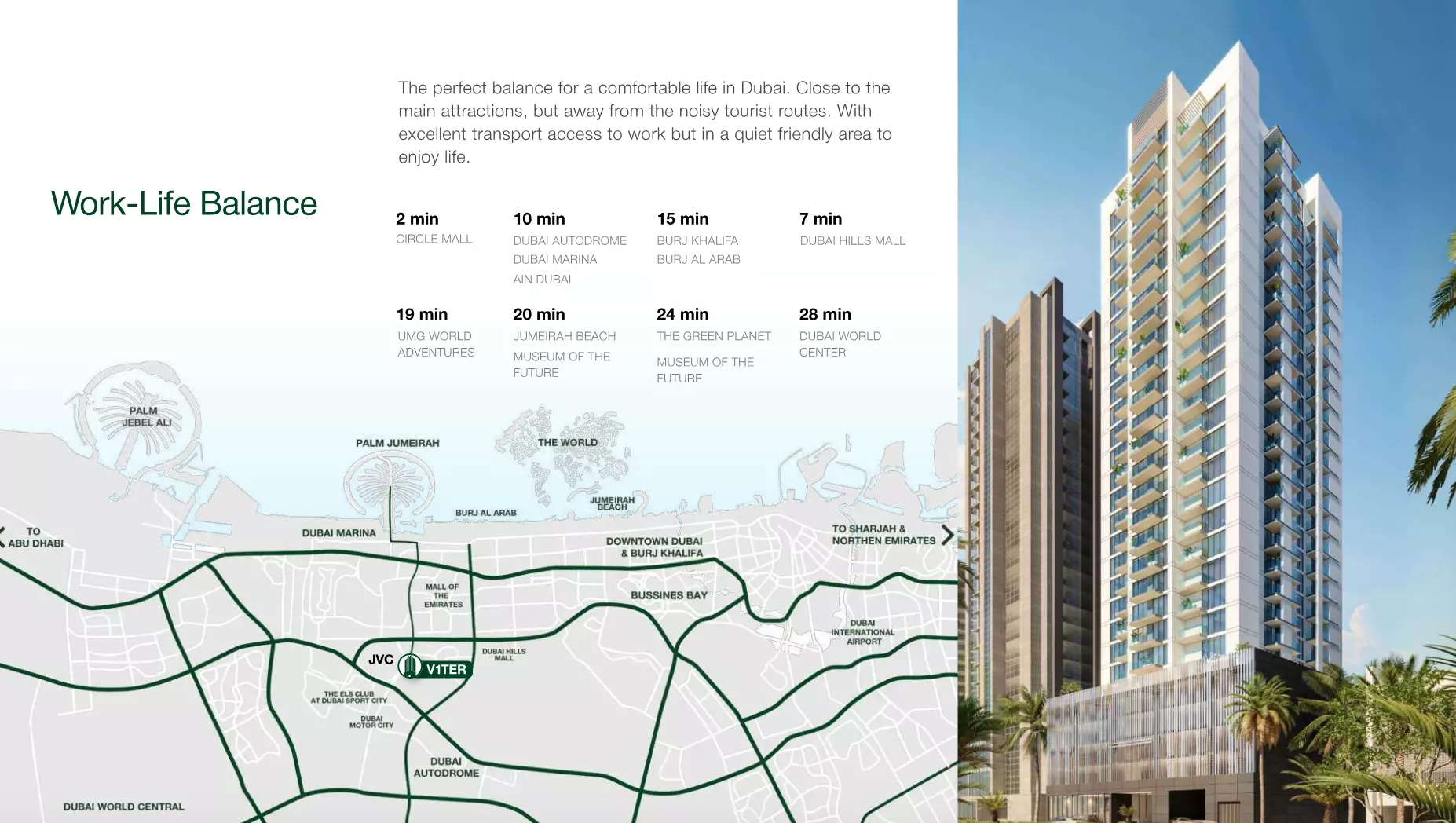 اقامتگاه وی۱تر به دلیل موقعیت مکانی ممتاز در دایره دهکده جمیرا، منطقه ای بسیار پرطرفدار با اتصال عالی، یک فرصت سرمایه گذاری قوی است. این پروژه طیف وسیعی از آپارتمان های لوکس با مبلمان و لوازم ایتالیایی درجه یک را ارائه می دهد و یک تجربه زندگی درجه یک را تضمین می کند. با انواع امکانات رفاهی، از جمله مرکز تناسب اندام، اسپا و استودیوی یوگا، به سبک زندگی مدرن پاسخ می دهد. موقعیت استراتژیک، طراحی با کیفیت و ویژگی های گسترده این توسعه، آن را به انتخابی عالی برای صاحبان خانه و سرمایه گذارانی که به دنبال ارزش بلندمدت در بازار پررونق املاک دبی هستند، تبدیل کرده است.